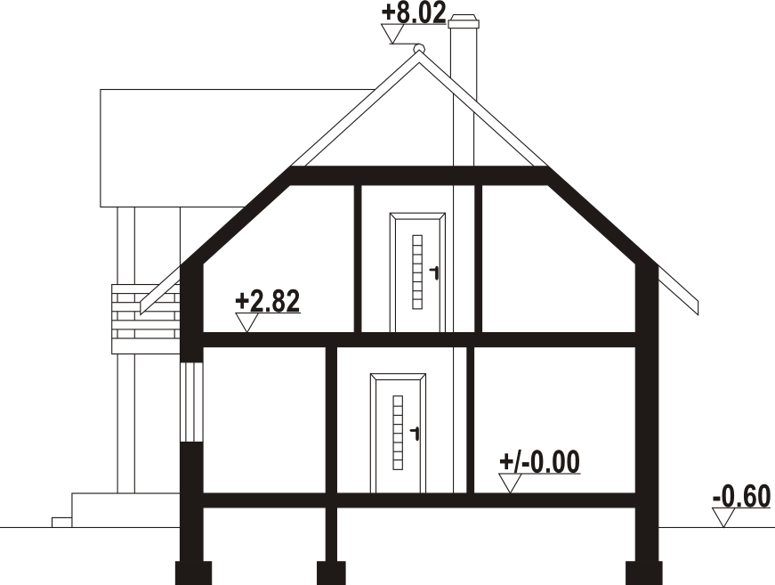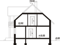 Wysokość ścianki kolankowej: 1.14 m. Strop: płyta żelbetowa. Pokrycie dachu: dachówka ceramiczna. Ściany zewnętrzne: pustaki ceramiczne + styropian. Ściany wewnętrzne: pustaki ceramiczne. Typ ogrzewania: kocioł gazowy. Instalacje dodatkowe: instalacja solarna.
