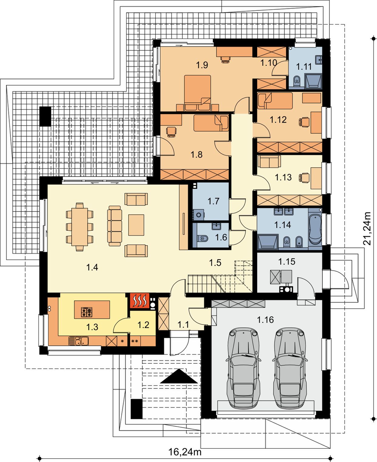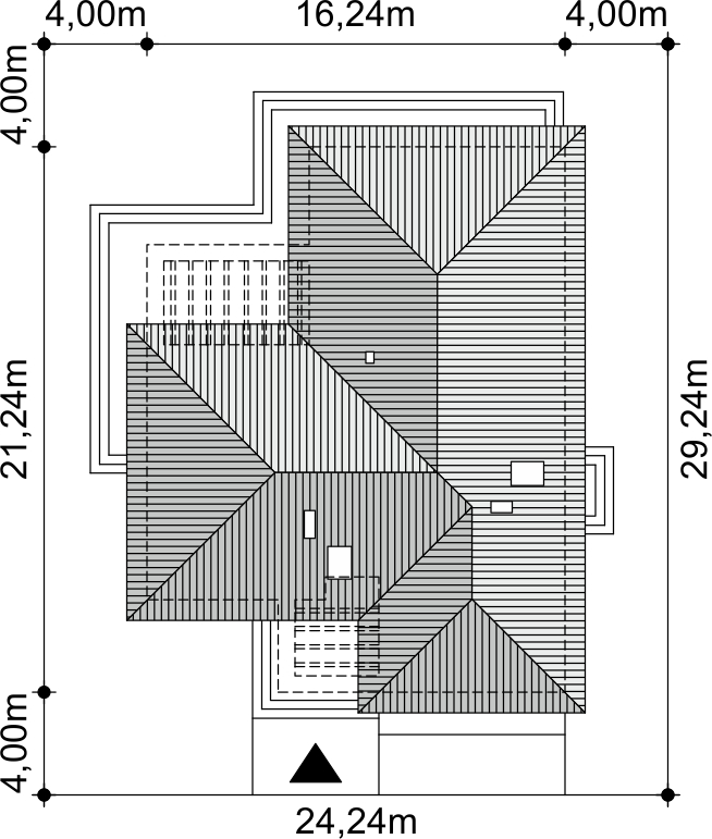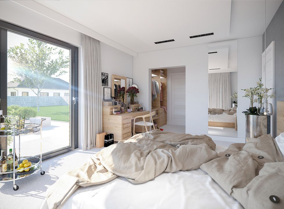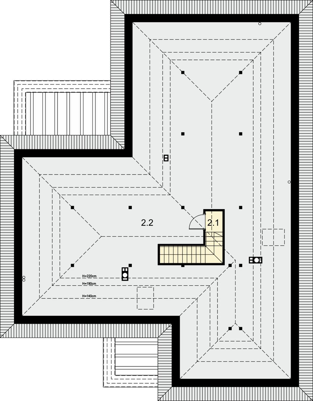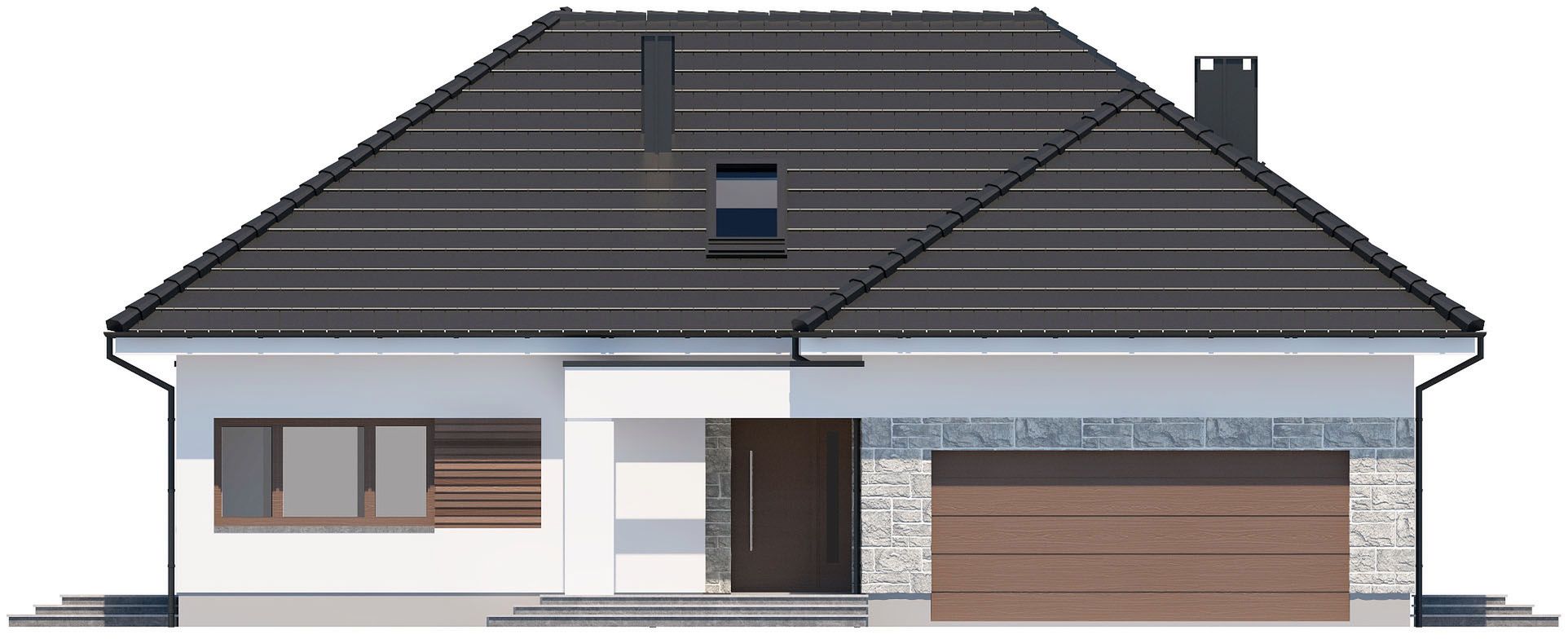 Graficzne opracowanie rzutów poglądowych widocznych na karcie projektu zostało wykonane przez Extradom.pl. Prezentowane przez Extradom.pl wizualizacje wykonane zostały przez autora projektu i należy poczytywać je jedynie za przykład i propozycję wykończenia, wizję architektoniczną autora projektu. Ostateczne wykończenie budynku może nastąpić na wiele sposobów. Szczegółowe rozwiązania zastosowane w oferowanej dokumentacji - w tym również ilość, lokalizacje i wygląd okien, drzwi, kominów - mogą w niewielkim stopniu różnić się od prezentowanej wizualizacji budynku.