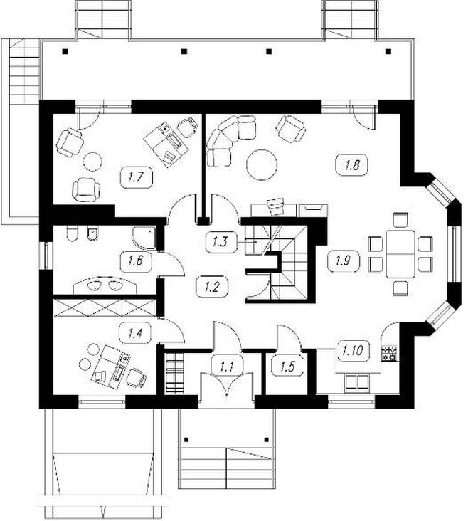 Graficzne opracowanie rzutów poglądowych widocznych na karcie projektu zostało wykonane przez Extradom.pl. Prezentowane przez Extradom.pl wizualizacje wykonane zostały przez autora projektu i należy poczytywać je jedynie za przykład i propozycję wykończenia, wizję architektoniczną autora projektu. Ostateczne wykończenie budynku może nastąpić na wiele sposobów. Szczegółowe rozwiązania zastosowane w oferowanej dokumentacji - w tym również ilość, lokalizacje i wygląd okien, drzwi, kominów - mogą w niewielkim stopniu różnić się od prezentowanej wizualizacji budynku.