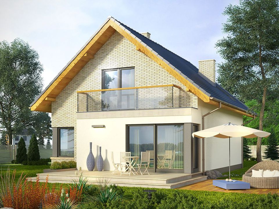 Dom wybudować można z bloczków z betonu komórkowego, ocieplonych warstwą styropianu. Strop TERIVA to popularne rozwiązanie w domkach jednorodzinnych, zastosowane również w tym projekcie. Przewidziano drewnianą więźbę dachową. Materiały wykończeniowe to tynk i płytki klinkierowe (ściany), dachówka ceramiczna lub betonowa (dach). Podczas adaptacji materiały zamienić można na inne.