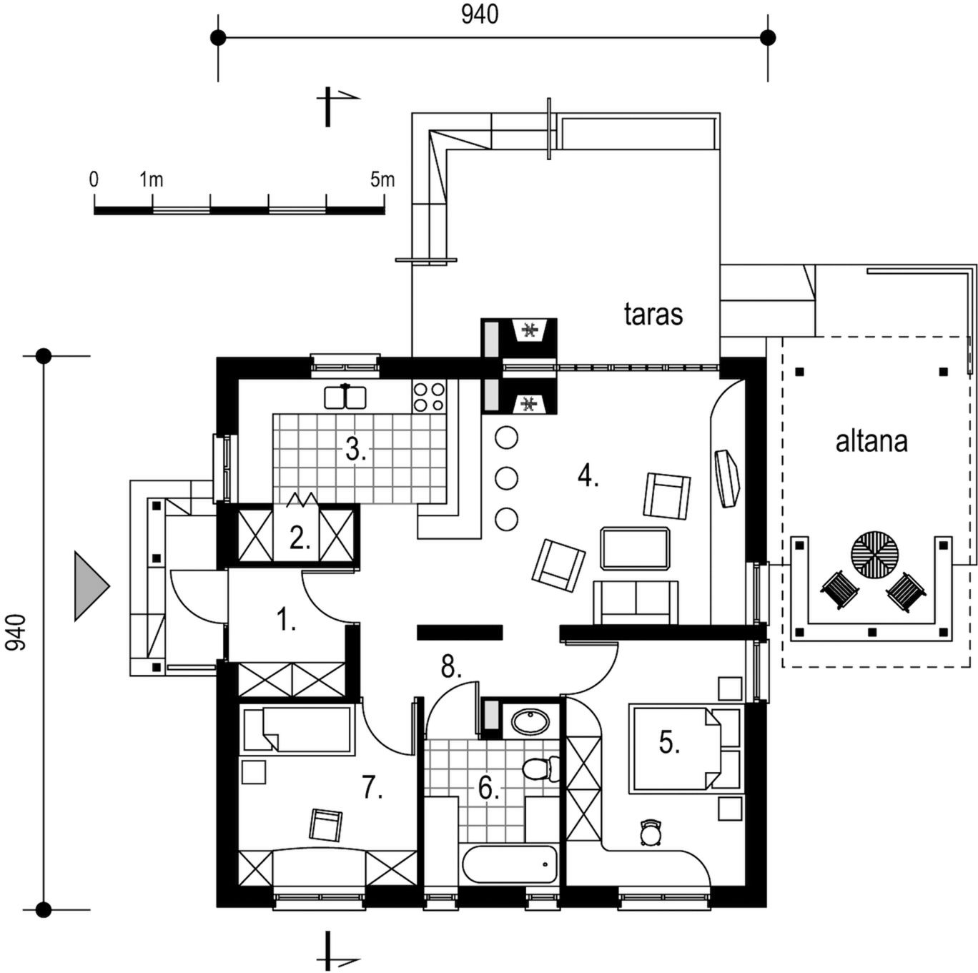 Ściany zewnętrzne dwuwarstwowe: cegła SILKA + wełna mineralna + tynk. Ściany wewnętrzne: cegła SILKA i/lub płyty na ruszcie stalowym, wygłuszone wełną mineralną. Strop: drewniany. Więźba dachowa: tradycyjna drewniana. Poszycie dachu: dachówka cementowa. Stolarka: drewniana lub PCV. Instalacja centralnego ogrzewania: kocioł dwufunkcyjny + grzejniki.