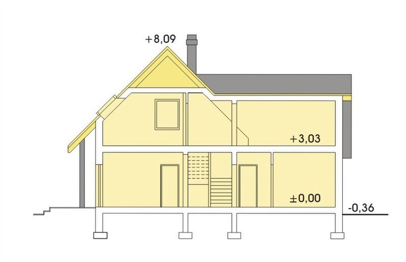 Strop: gęstożebrowy Teriva I. Ściany zewnętrzne: gazobeton 36,5cm. Pokrycie dachowe: dachówka ceramiczna. Okna połaciowe: Velux.