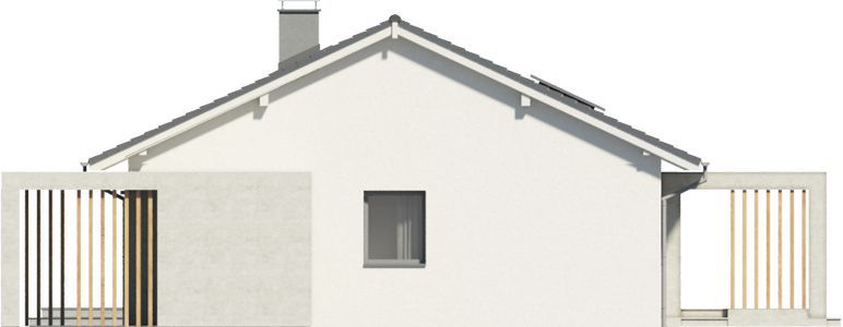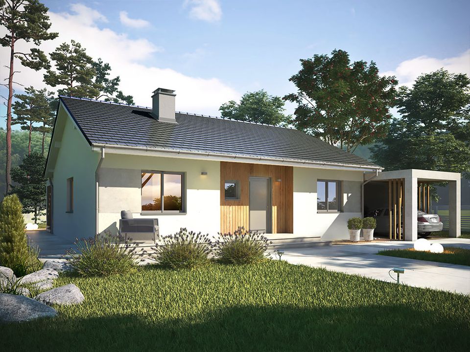 Dom zbudowano w technologii murowanej, z gazobetonowych ścian ocieplonych styropianem oraz z lekkim sufitem podwieszanym z wełną mineralną. Wiata garażowa i pergola powstały z połączenia drewna i betonu, tworząc spójną całość z jasną, elegancką elewacją uzupełnioną naturalnymi akcentami.