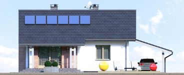 Graficzne opracowanie rzutów poglądowych widocznych na karcie projektu zostało wykonane przez Extradom.pl. Prezentowane przez Extradom.pl wizualizacje wykonane zostały przez autora projektu i należy poczytywać je jedynie za przykład i propozycję wykończenia, wizję architektoniczną autora projektu. Ostateczne wykończenie budynku może nastąpić na wiele sposobów. Szczegółowe rozwiązania zastosowane w oferowanej dokumentacji - w tym również ilość, lokalizacje i wygląd okien, drzwi, kominów - mogą w niewielkim stopniu różnić się od prezentowanej wizualizacji budynku.