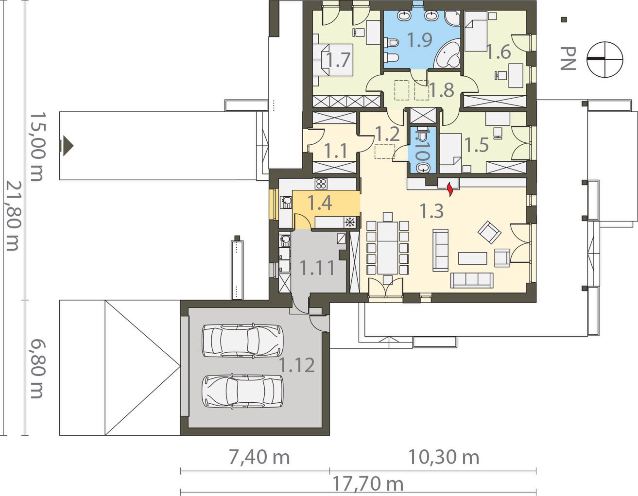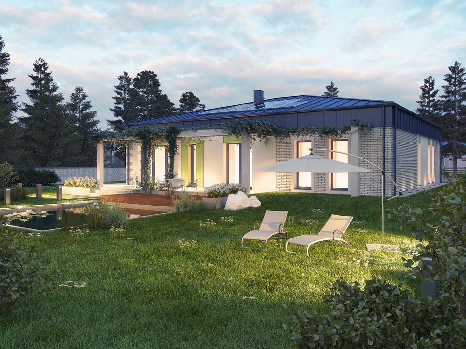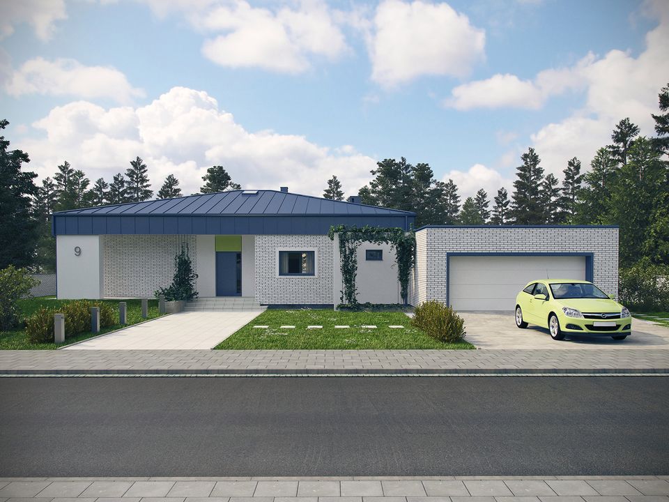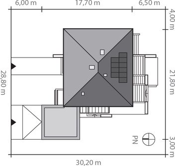 Graficzne opracowanie rzutów poglądowych widocznych na karcie projektu zostało wykonane przez Extradom.pl. Prezentowane przez Extradom.pl wizualizacje wykonane zostały przez autora projektu i należy poczytywać je jedynie za przykład i propozycję wykończenia, wizję architektoniczną autora projektu. Ostateczne wykończenie budynku może nastąpić na wiele sposobów. Szczegółowe rozwiązania zastosowane w oferowanej dokumentacji - w tym również ilość, lokalizacje i wygląd okien, drzwi, kominów - mogą w niewielkim stopniu różnić się od prezentowanej wizualizacji budynku.
