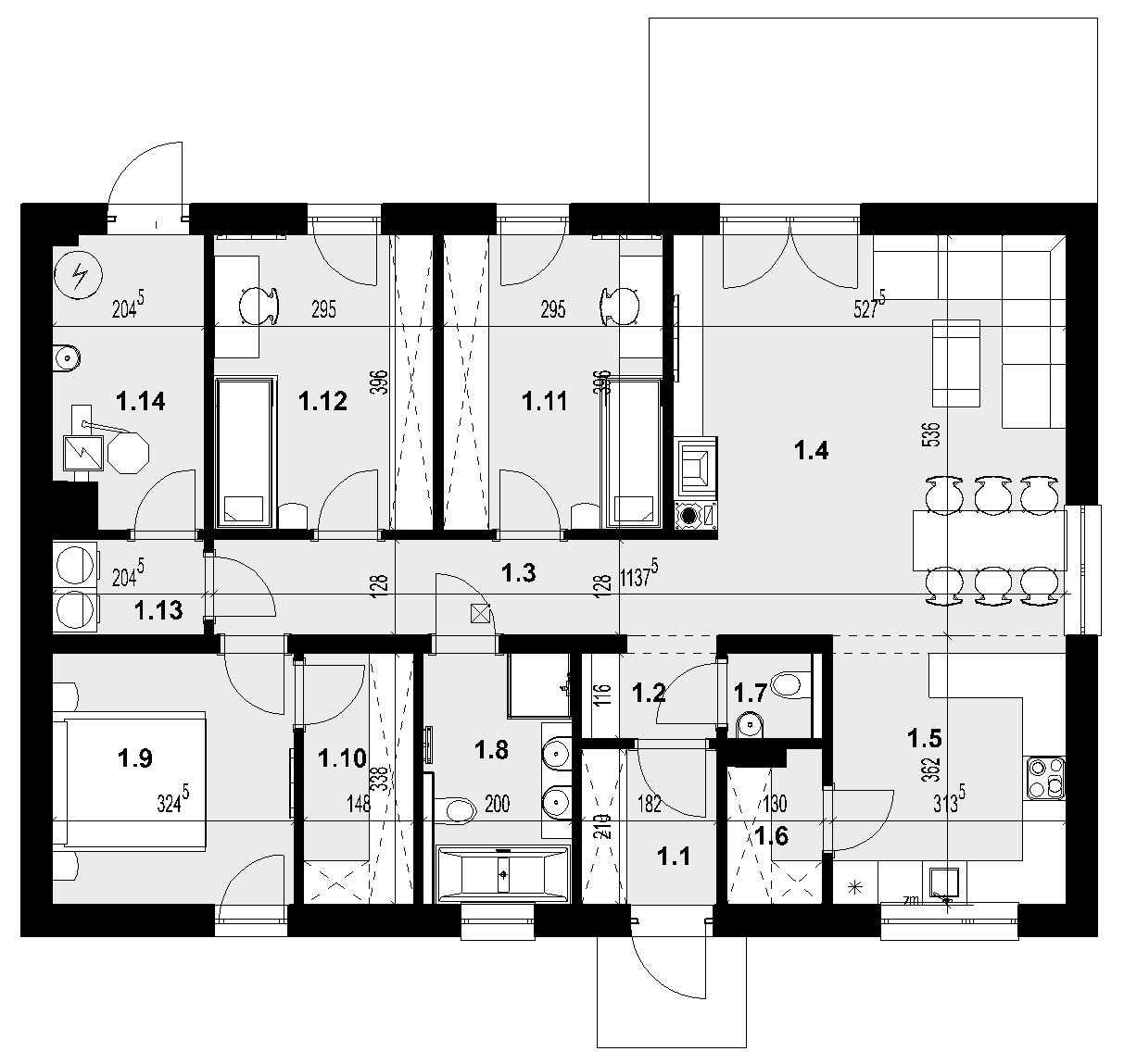 Graficzne opracowanie rzutów poglądowych widocznych na karcie projektu zostało wykonane przez Extradom.pl. Prezentowane przez Extradom.pl wizualizacje wykonane zostały przez autora projektu i należy poczytywać je jedynie za przykład i propozycję wykończenia, wizję architektoniczną autora projektu. Ostateczne wykończenie budynku może nastąpić na wiele sposobów. Szczegółowe rozwiązania zastosowane w oferowanej dokumentacji - w tym również ilość, lokalizacje i wygląd okien, drzwi, kominów - mogą w niewielkim stopniu różnić się od prezentowanej wizualizacji budynku.