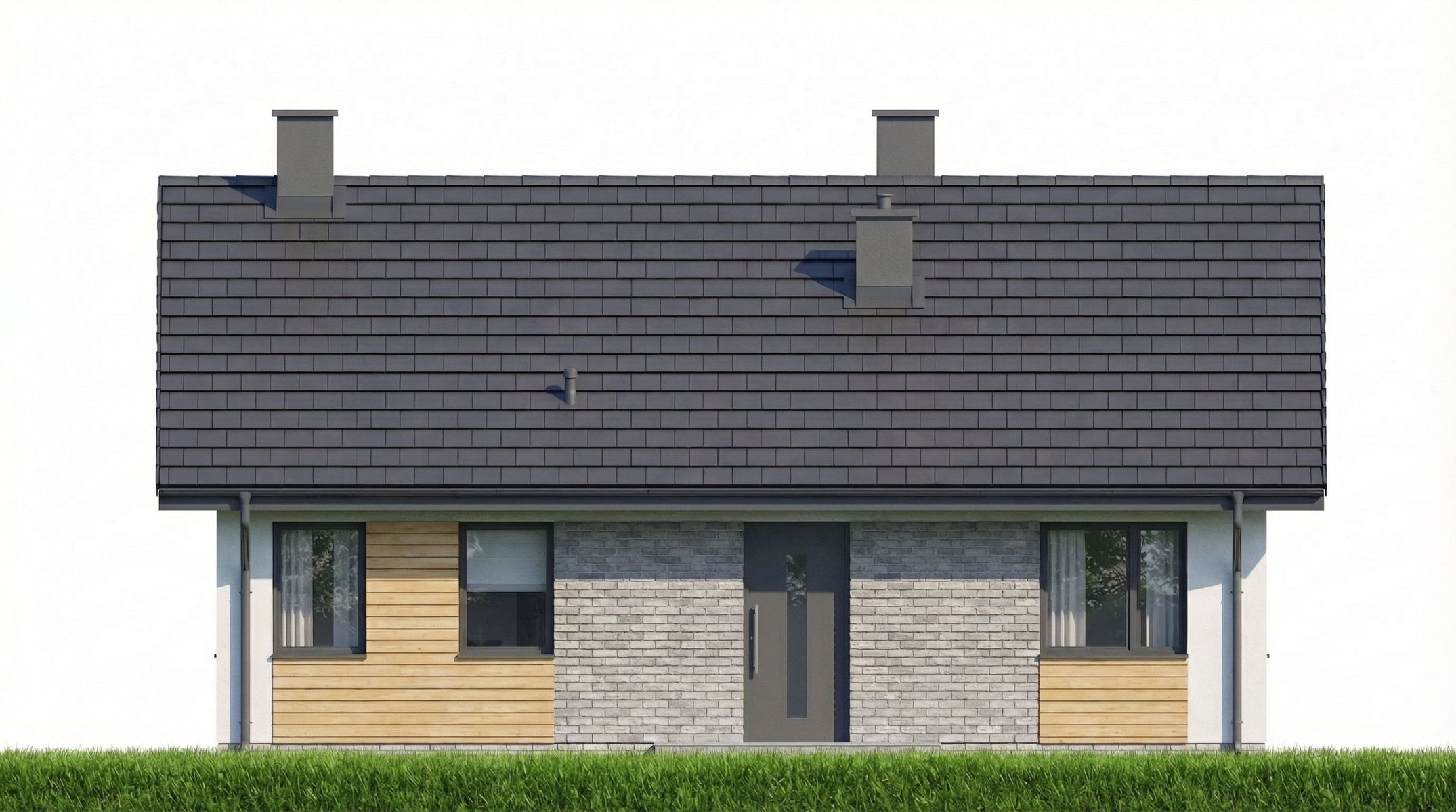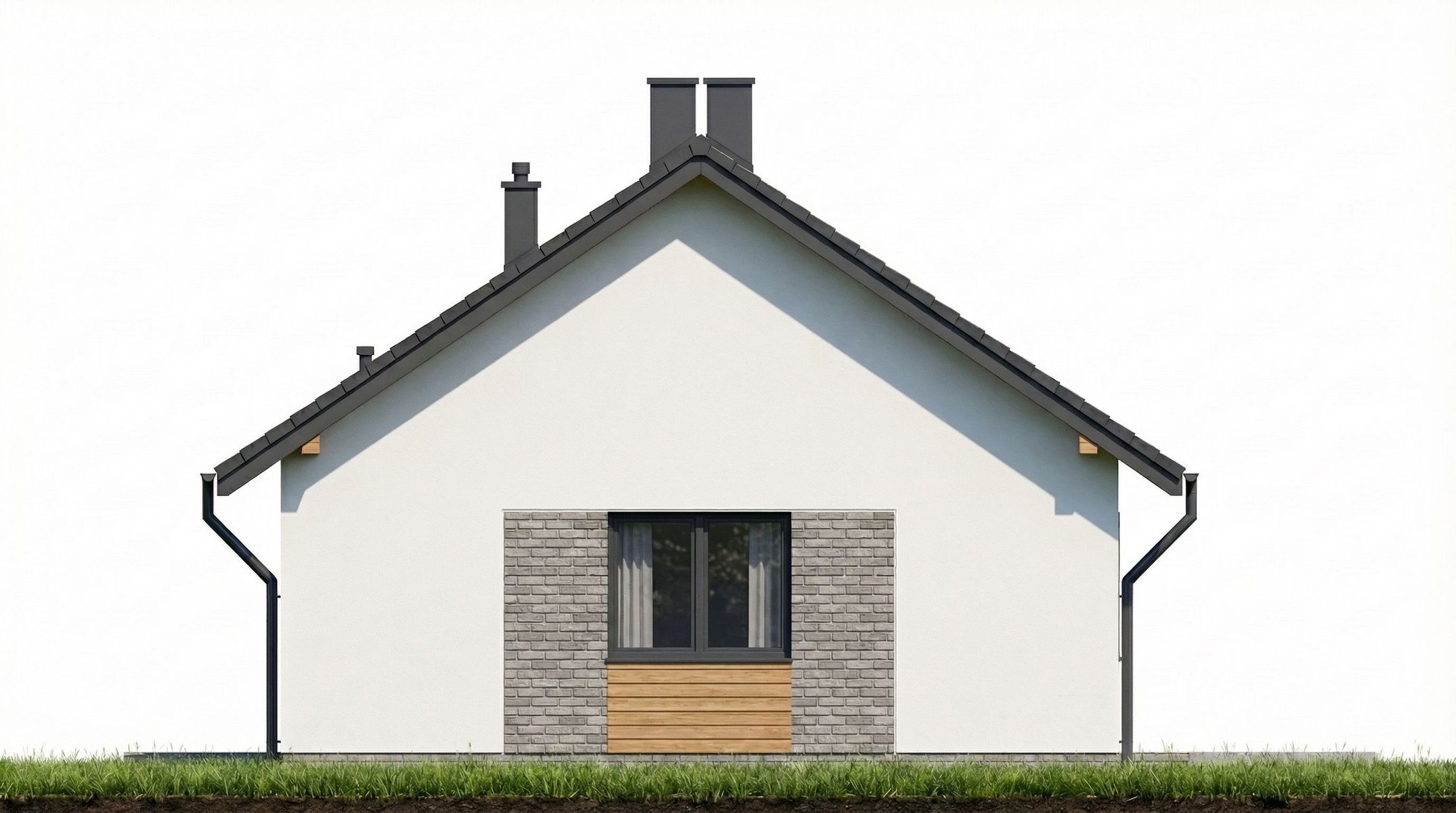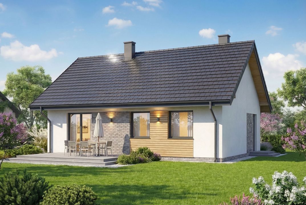 Graficzne opracowanie rzutów poglądowych widocznych na karcie projektu zostało wykonane przez Extradom.pl. Prezentowane przez Extradom.pl wizualizacje wykonane zostały przez autora projektu i należy poczytywać je jedynie za przykład i propozycję wykończenia, wizję architektoniczną autora projektu. Ostateczne wykończenie budynku może nastąpić na wiele sposobów. Szczegółowe rozwiązania zastosowane w oferowanej dokumentacji - w tym również ilość, lokalizacje i wygląd okien, drzwi, kominów - mogą w niewielkim stopniu różnić się od prezentowanej wizualizacji budynku.