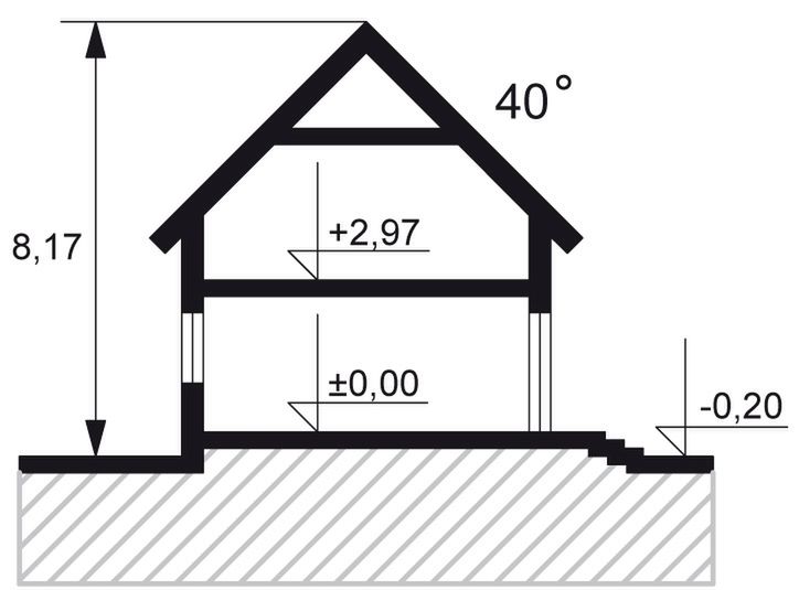 Fundamenty: betonowe ławy i ściany fundamentowe z bloczków betonowych. Ściany zewnętrzne: ściany murowane - pustaki porotherm 25 + styropian + tynk cienkowarstwowy. Strop: Teriva. Elewacje: tynk cienkowarstwowy na styropianie. Pokrycie dachu: dachówka. Nachylenie dachu: 40 stopni.