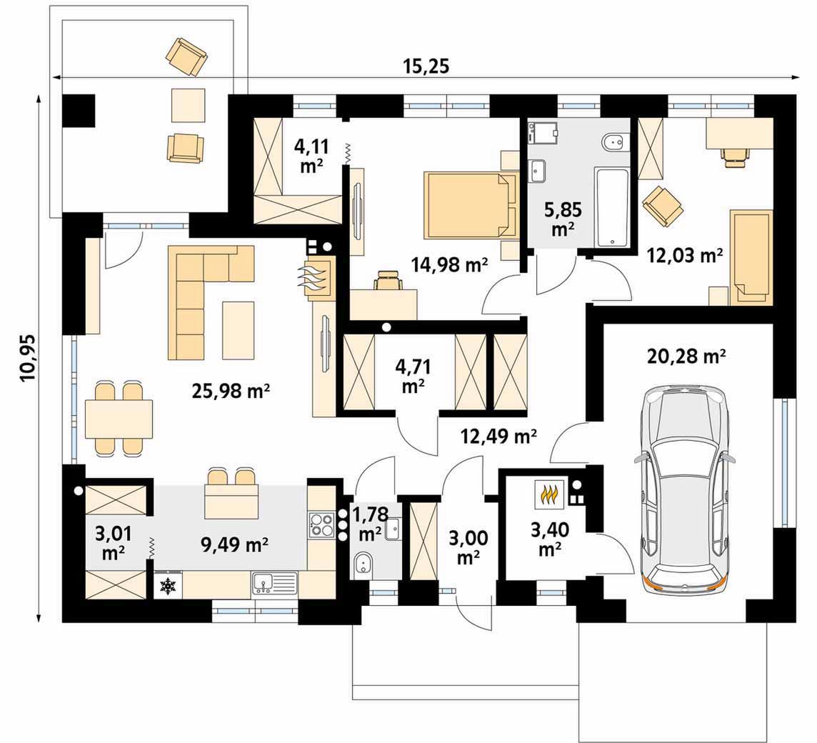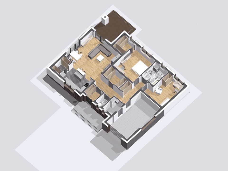 Graficzne opracowanie rzutów poglądowych widocznych na karcie projektu zostało wykonane przez Extradom.pl. Prezentowane przez Extradom.pl wizualizacje wykonane zostały przez autora projektu i należy poczytywać je jedynie za przykład i propozycję wykończenia, wizję architektoniczną autora projektu. Ostateczne wykończenie budynku może nastąpić na wiele sposobów. Szczegółowe rozwiązania zastosowane w oferowanej dokumentacji - w tym również ilość, lokalizacje i wygląd okien, drzwi, kominów - mogą w niewielkim stopniu różnić się od prezentowanej wizualizacji budynku.