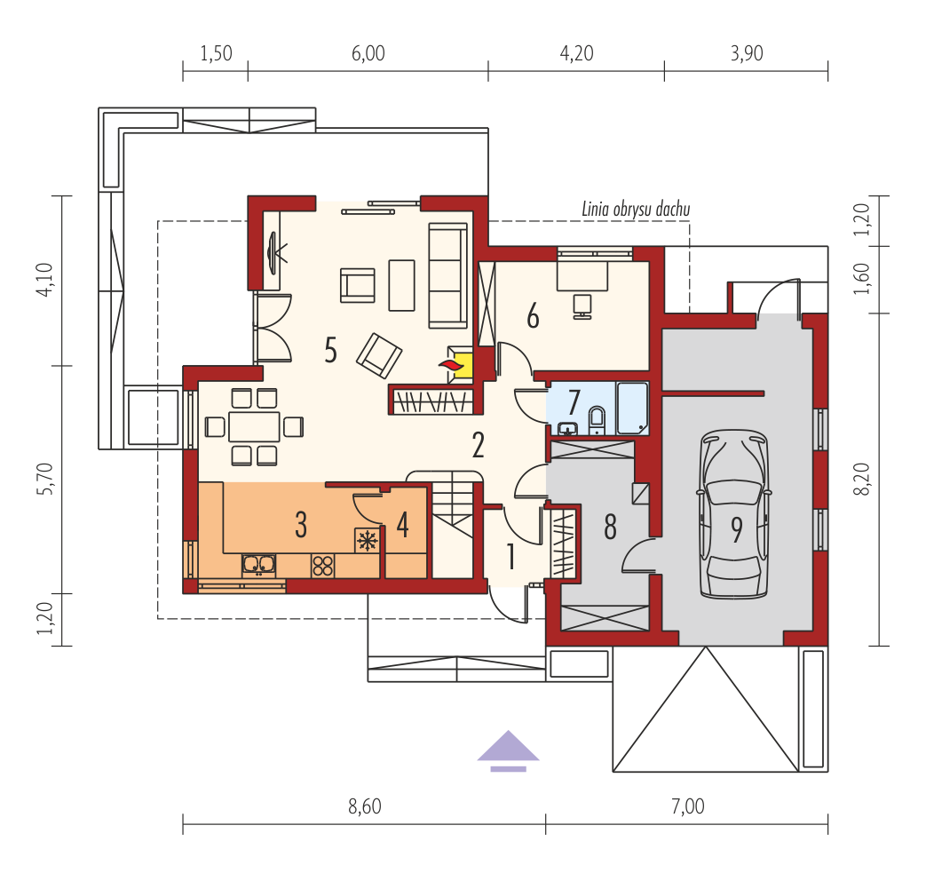 Graficzne opracowanie rzutów poglądowych widocznych na karcie projektu zostało wykonane przez Extradom.pl. Prezentowane przez Extradom.pl wizualizacje wykonane zostały przez autora projektu i należy poczytywać je jedynie za przykład i propozycję wykończenia, wizję architektoniczną autora projektu. Ostateczne wykończenie budynku może nastąpić na wiele sposobów. Szczegółowe rozwiązania zastosowane w oferowanej dokumentacji - w tym również ilość, lokalizacje i wygląd okien, drzwi, kominów - mogą w niewielkim stopniu różnić się od prezentowanej wizualizacji budynku.