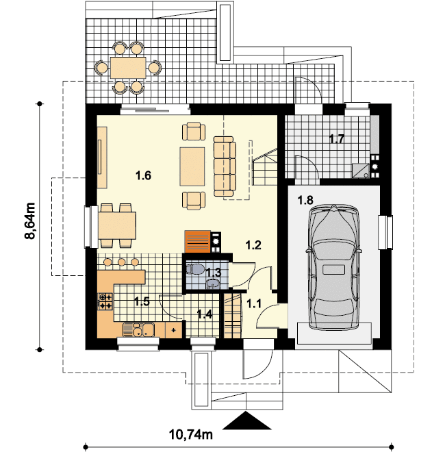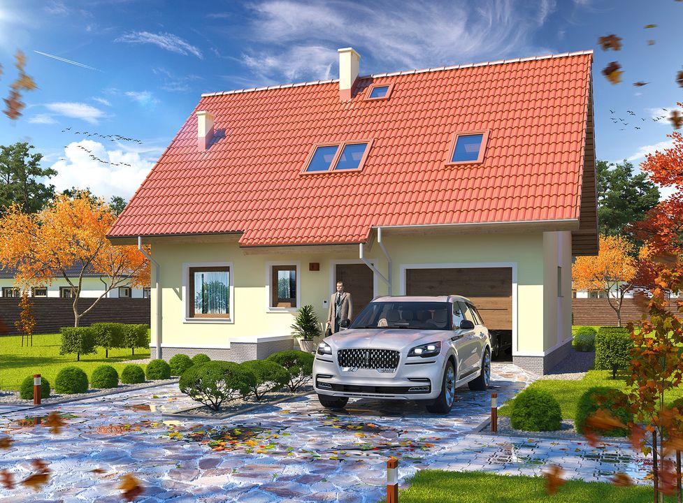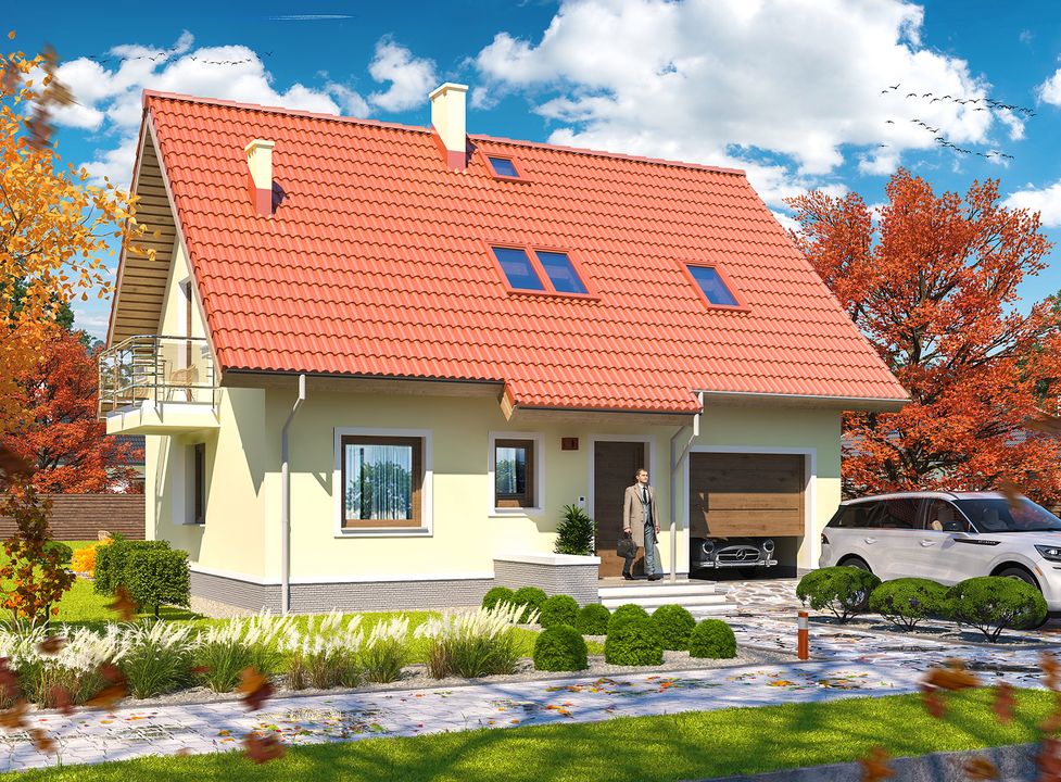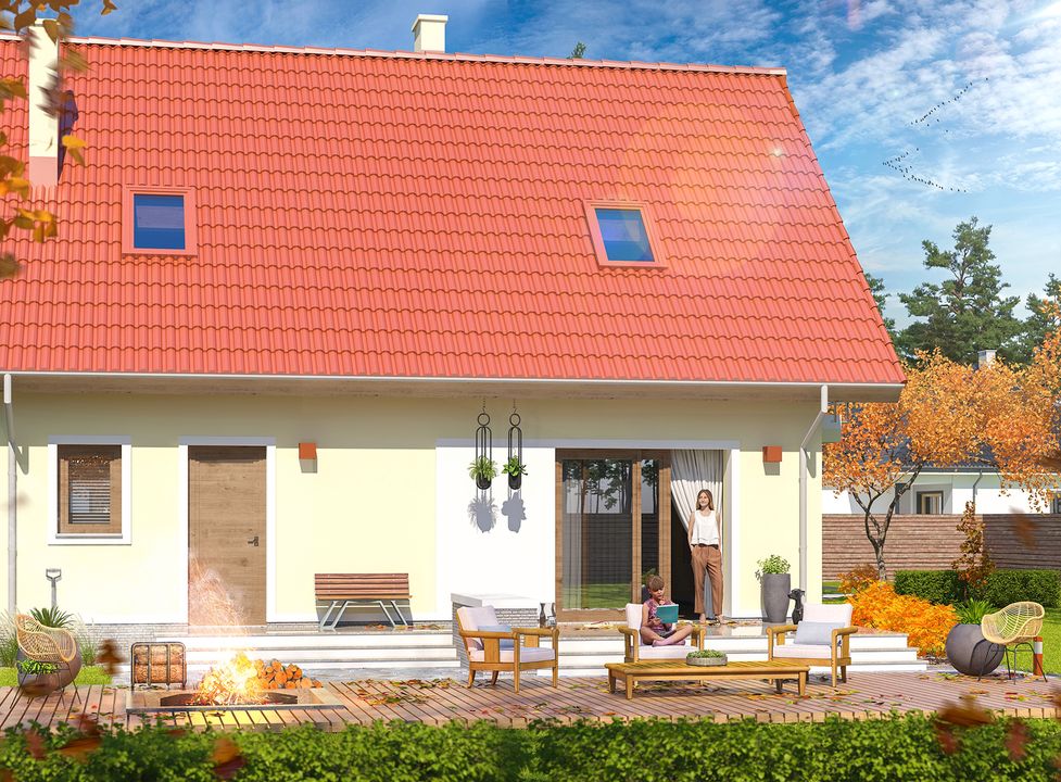Graficzne opracowanie rzutów poglądowych widocznych na karcie projektu zostało wykonane przez Extradom.pl. Prezentowane przez Extradom.pl wizualizacje wykonane zostały przez autora projektu i należy poczytywać je jedynie za przykład i propozycję wykończenia, wizję architektoniczną autora projektu. Ostateczne wykończenie budynku może nastąpić na wiele sposobów. Szczegółowe rozwiązania zastosowane w oferowanej dokumentacji - w tym również ilość, lokalizacje i wygląd okien, drzwi, kominów - mogą w niewielkim stopniu różnić się od prezentowanej wizualizacji budynku.