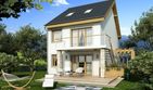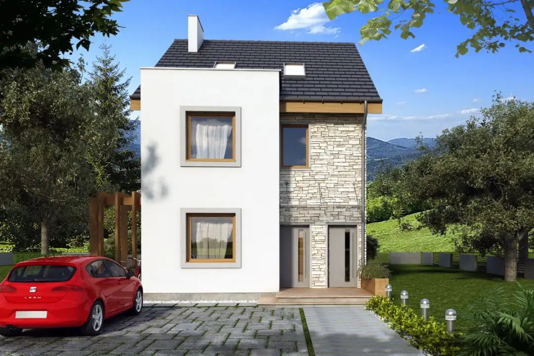 Graficzne opracowanie rzutów poglądowych widocznych na karcie projektu zostało wykonane przez Extradom.pl. Prezentowane przez Extradom.pl wizualizacje wykonane zostały przez autora projektu i należy poczytywać je jedynie za przykład i propozycję wykończenia, wizję architektoniczną autora projektu. Ostateczne wykończenie budynku może nastąpić na wiele sposobów. Szczegółowe rozwiązania zastosowane w oferowanej dokumentacji - w tym również ilość, lokalizacje i wygląd okien, drzwi, kominów - mogą w niewielkim stopniu różnić się od prezentowanej wizualizacji budynku.