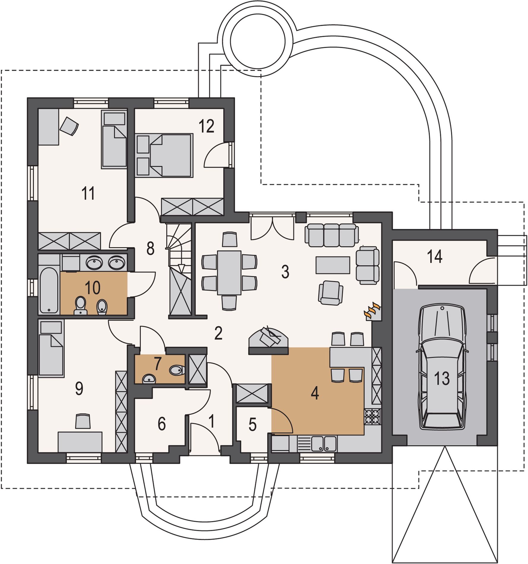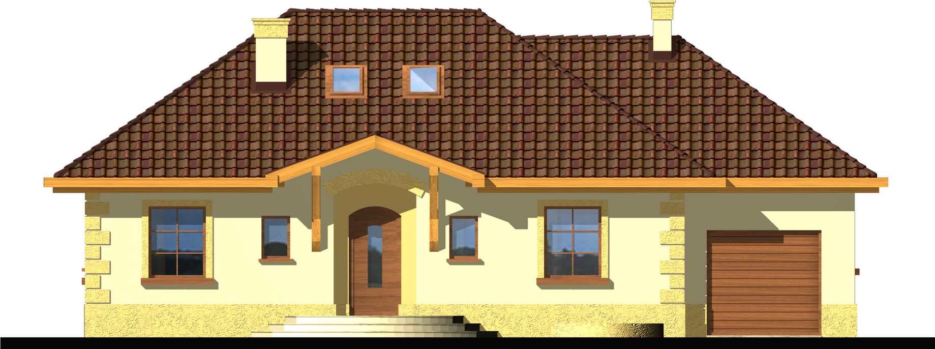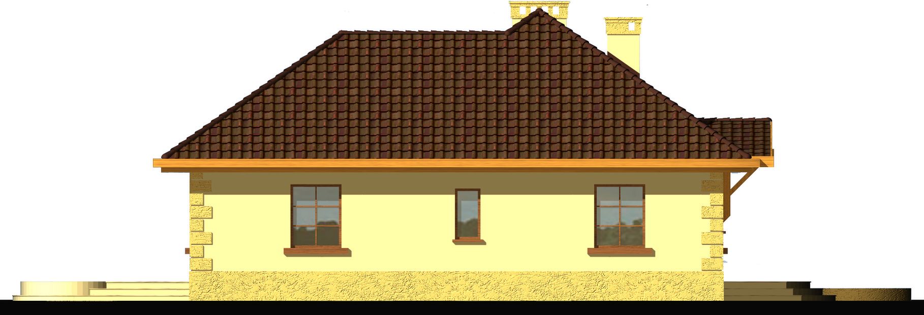 Graficzne opracowanie rzutów poglądowych widocznych na karcie projektu zostało wykonane przez Extradom.pl. Prezentowane przez Extradom.pl wizualizacje wykonane zostały przez autora projektu i należy poczytywać je jedynie za przykład i propozycję wykończenia, wizję architektoniczną autora projektu. Ostateczne wykończenie budynku może nastąpić na wiele sposobów. Szczegółowe rozwiązania zastosowane w oferowanej dokumentacji - w tym również ilość, lokalizacje i wygląd okien, drzwi, kominów - mogą w niewielkim stopniu różnić się od prezentowanej wizualizacji budynku.