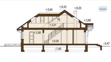 Konstrukcja ściany zewnętrzne - beton komórkowy gr.24cm + styropian Termo Organika Termonium Plus gr. 12cm; ściany wewnetrzne - bloczek silikatowy gr. 24cm; ściany fundamentowe - bloczek betonowy; strop - Teriva; konstrukcja dachu - drewniana Instalacje W projekcie przewidziano instalacjie: c.o. i c.w.u. zasilana kotłem gazowym, grzejniki płytowe, instalacje wodno-kanalizacyjna oraz elektryczne, wentylacja grawitacyjna. Wykończenie pokrycie dachowe - dachówka cementowa (w ramach adaptacji inny materiał); ścianki działowe na parterze-bloczek silikatowy; poddzasze strychowe - płyty gips.-kart.; schody drewniane - zabiegowe, okna - PVC; okna dachowe i wyłaz dachowy - Fakro.