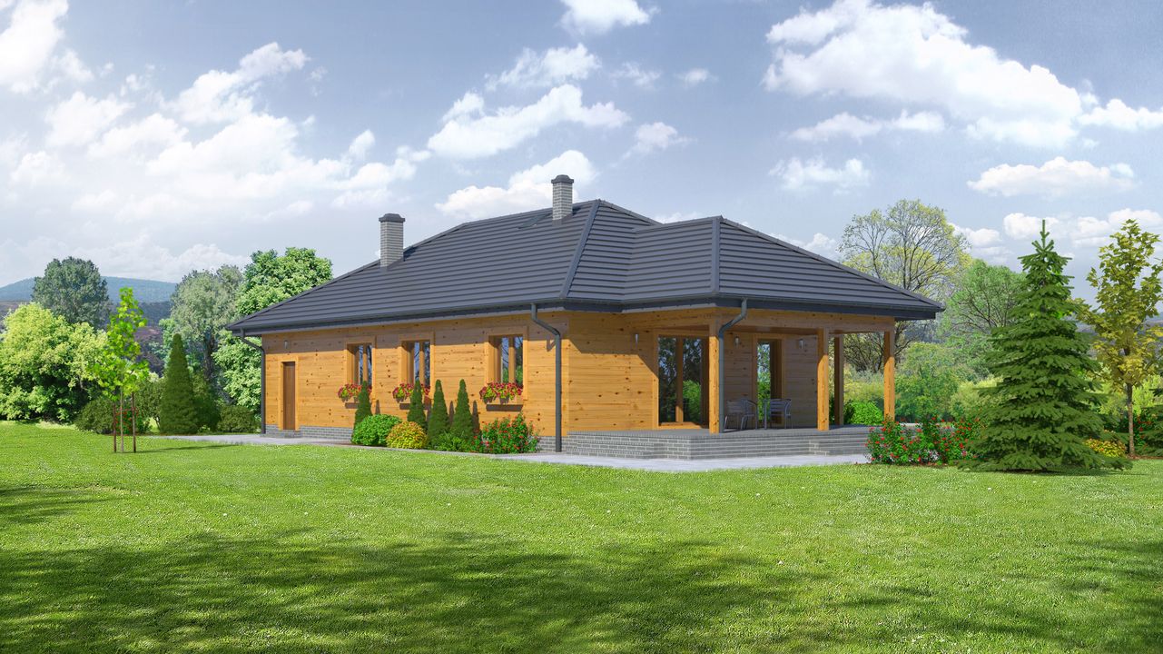 Graficzne opracowanie rzutów poglądowych widocznych na karcie projektu zostało wykonane przez Extradom.pl. Prezentowane przez Extradom.pl wizualizacje wykonane zostały przez autora projektu i należy poczytywać je jedynie za przykład i propozycję wykończenia, wizję architektoniczną autora projektu. Ostateczne wykończenie budynku może nastąpić na wiele sposobów. Szczegółowe rozwiązania zastosowane w oferowanej dokumentacji - w tym również ilość, lokalizacje i wygląd okien, drzwi, kominów - mogą w niewielkim stopniu różnić się od prezentowanej wizualizacji budynku.
