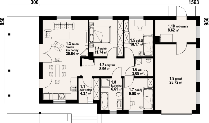 Strop: drewniany. Pokrycie dachu: dachówka gontopodobna Gerard Corona. Ściany zewnętrzne: szkieletowe drewniane ocieplone wełną mineralną. Ściany wewnętrzne: szkieletowe drewniane. Typ ogrzewania: kocioł gazowy lub kocioł na paliwo stałe. Inne: brama garażowa Hörmann.