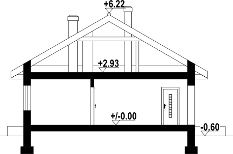 Wysokość ścianki kolankowej: 0.36 m. Strop: płyta żelbetowa. Pokrycie dachu: dachówka ceramiczna. Ściany zewnętrzne: pustaki ceramiczne + styropian. Ściany wewnętrzne: pustaki ceramiczne. Typ ogrzewania: kocioł gazowy.