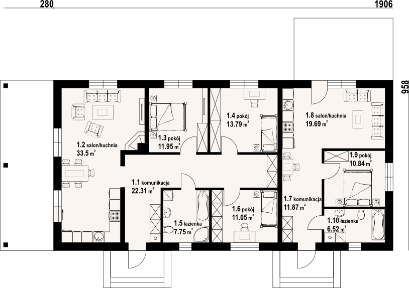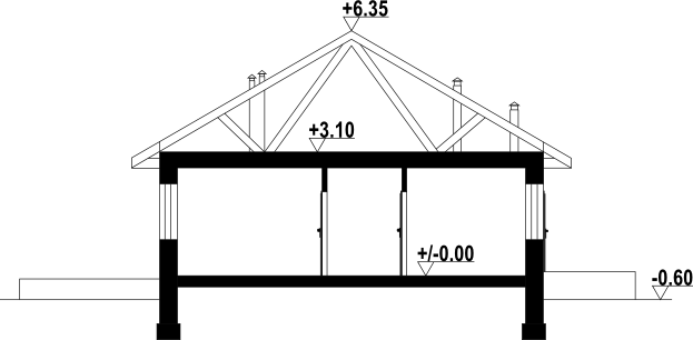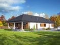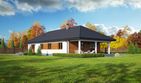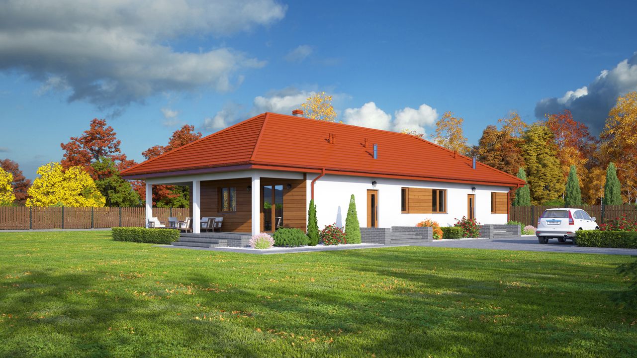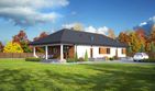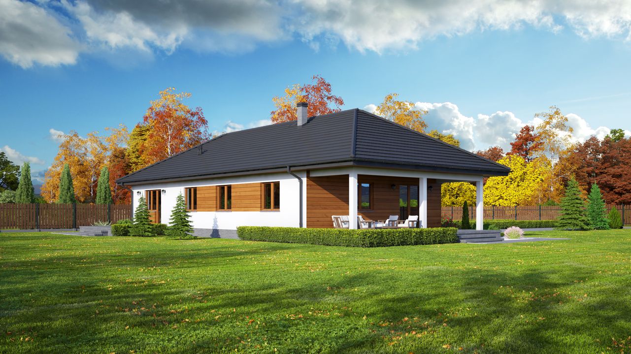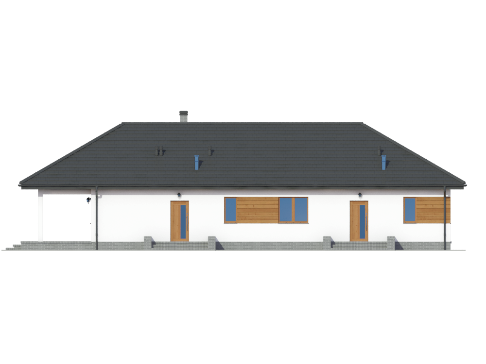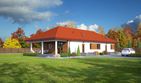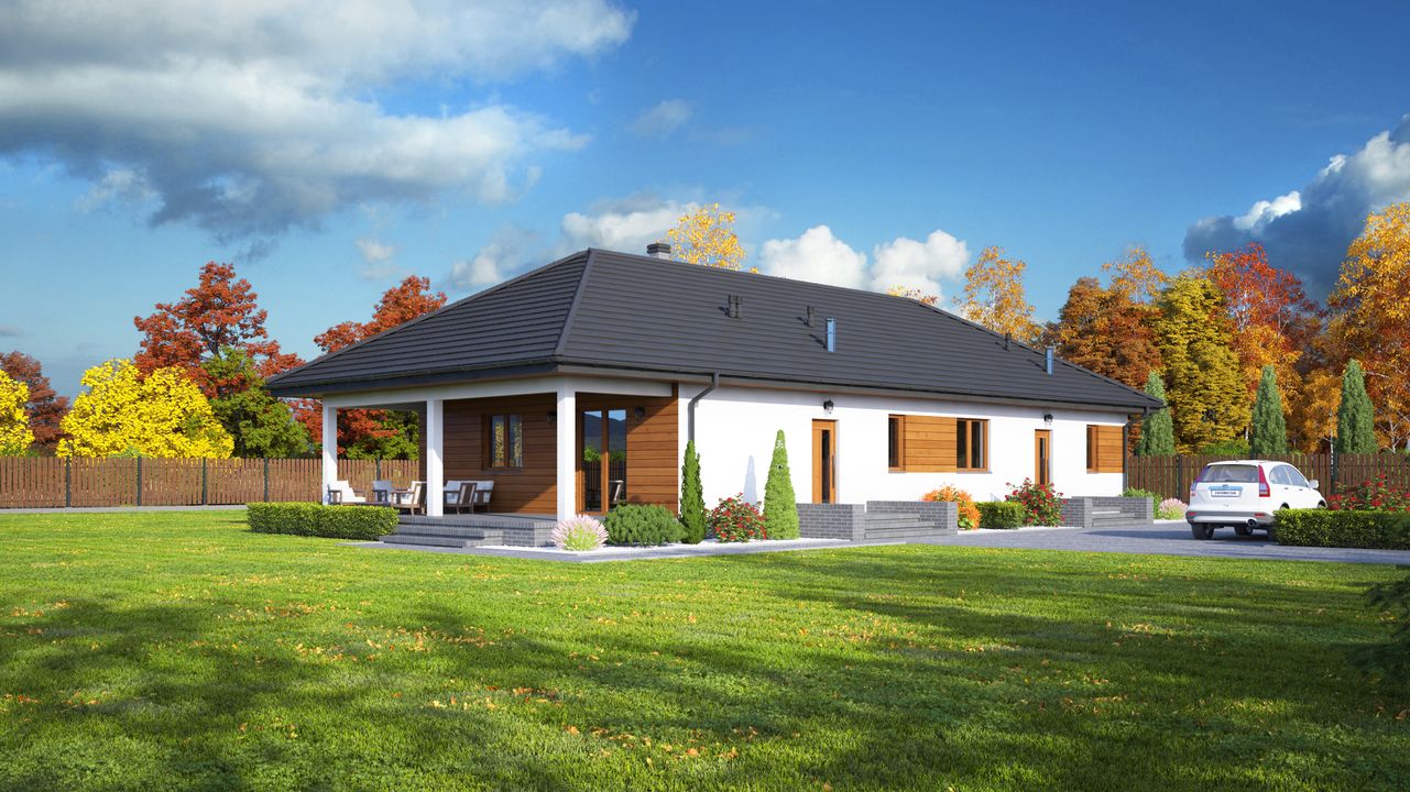Graficzne opracowanie rzutów poglądowych widocznych na karcie projektu zostało wykonane przez Extradom.pl. Prezentowane przez Extradom.pl wizualizacje wykonane zostały przez autora projektu i należy poczytywać je jedynie za przykład i propozycję wykończenia, wizję architektoniczną autora projektu. Ostateczne wykończenie budynku może nastąpić na wiele sposobów. Szczegółowe rozwiązania zastosowane w oferowanej dokumentacji - w tym również ilość, lokalizacje i wygląd okien, drzwi, kominów - mogą w niewielkim stopniu różnić się od prezentowanej wizualizacji budynku.