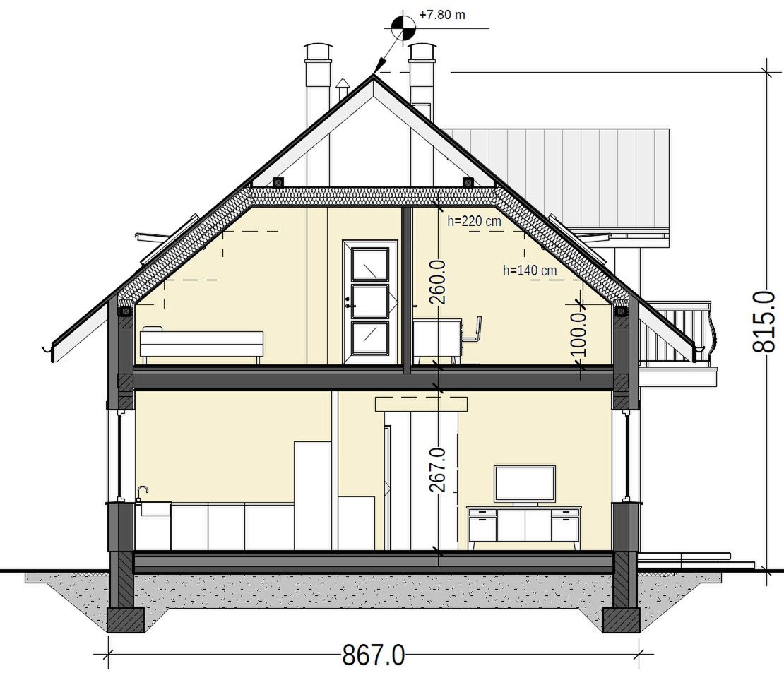 Posadowienie bezpośrednie na zbrojonych ławach i stopach fundamentowych wykonanych z betonu B 20. Ściany fundamentowe: murowane z bloczków betonowych M6. Ściany zewnętrzne: bloczki gazobetonowe gr. 25cm na zaprawie systemowej, ciepłochronnej, ocieplony styropianem fasadowym gr. 15cm. Do ocieplenia budynku zaprojektowano użycie styropianu grafitowego gr. 15 cm, o współczynniku „lambda” nie przekraczającym 0,035 W(mK) i „oporze cieplnym” nie mniejszym niż Rd – 4,0 m2k/W. Zastosowanie materiałów budowlanych (ocieplenie ścian, dachu, podłogi na gruncie, okien i drzwi zewnętrznych) użytych w projekcie odpowiada nowym wymaganiom obowiązującym od stycznia 2021 roku (WT2021). Ściany nośne wewnętrzne: bloczki gazobetonowe gr. 25cm na zaprawie cementowo-wapiennej lub systemowej. Ściany wewnętrzne działowe: bloczki gazobetonowe gr. 12cm. Strop gęstożebrowy z wypełnieniem pustakami betonowymi, zalewany wraz z wieńcami betonem B 20. Konstrukcja dachu: drewniana, drewno klasy C24, więźba dachowa krokwiowo-jętkowa. Budynek, w wersji podstawowej, jest zaprojektowany z pomieszczeniem kotłowni wyposażonej w kocioł ekologiczny na paliwo stałe „pellet” i spełnia wszystkie wymagania dotyczące WT2021. Na etapie adaptacji projektu jest możliwość zaprojektowania ogrzewania gazowego ze wspomaganiem instalacją solarną lub ogrzewania nowoczesną pompa ciepła typu powietrze – woda. Projekt pod względem konstrukcyjnym spełnia normy zgodne z Eurokodami.