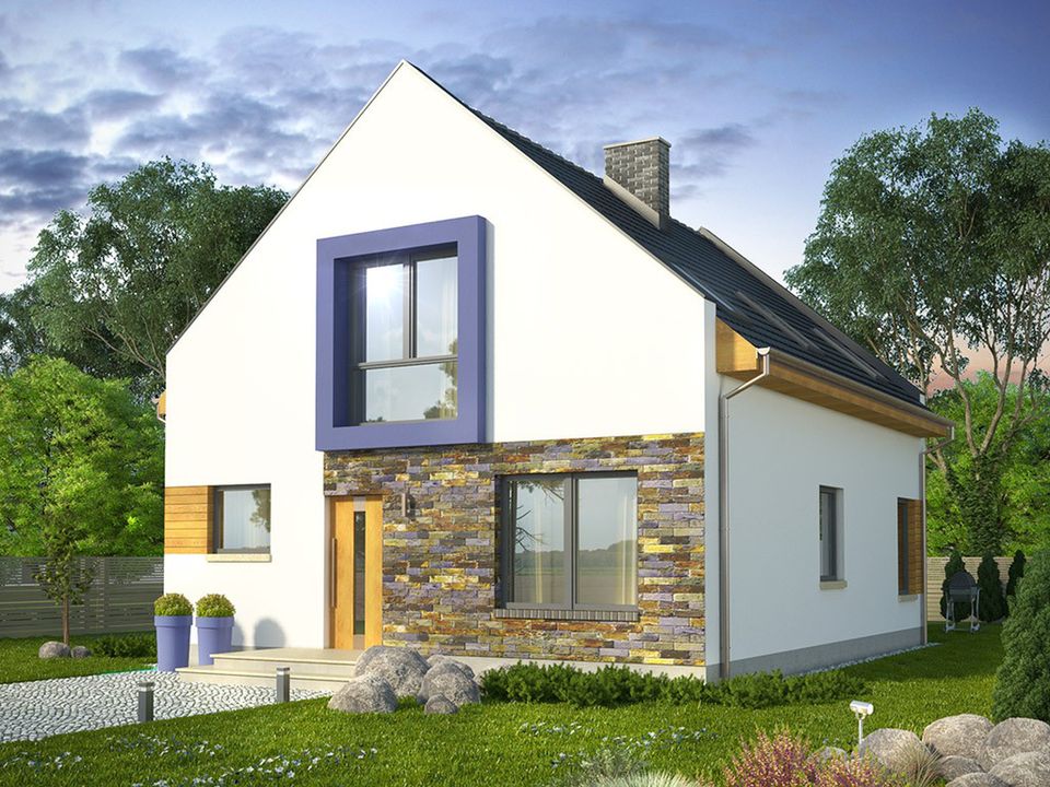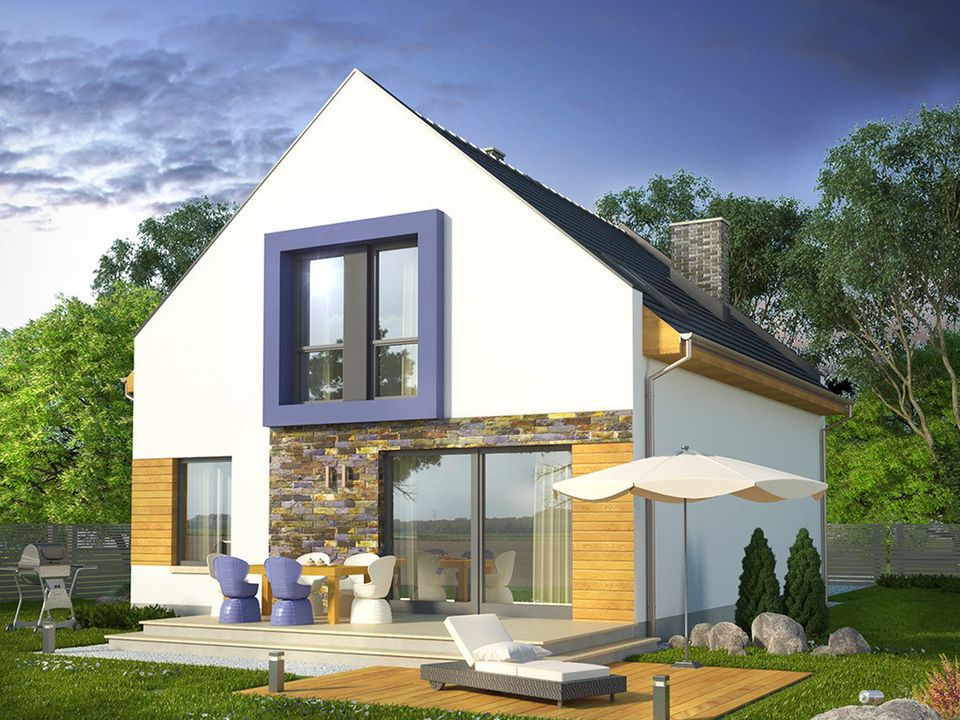 Dom wybudować można z bloczków z betonu komórkowego z dociepleniem, ze stropem typu TERIVA i drewnianą więźbą. Sugerowane materiały wykończeniowe to tynk z elementami drewnianymi (ściany) i dachówka ceramiczna lub betonowa (dach) i na etapie adaptacji można jednak zmienić je na inne.