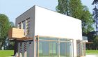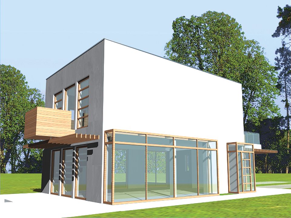 Dom zaprojektowano w technologii murowej ze stropami żelbetowymi. Schody wewnętrzne drewniane. Stropodach kryty folią termozgrzewalną. Elewację wykonano z płyt z polerowanego betonu lub z tynku o delikatnej fakturze oraz okładzin drewnianych. Stolarka okienna drewniana.