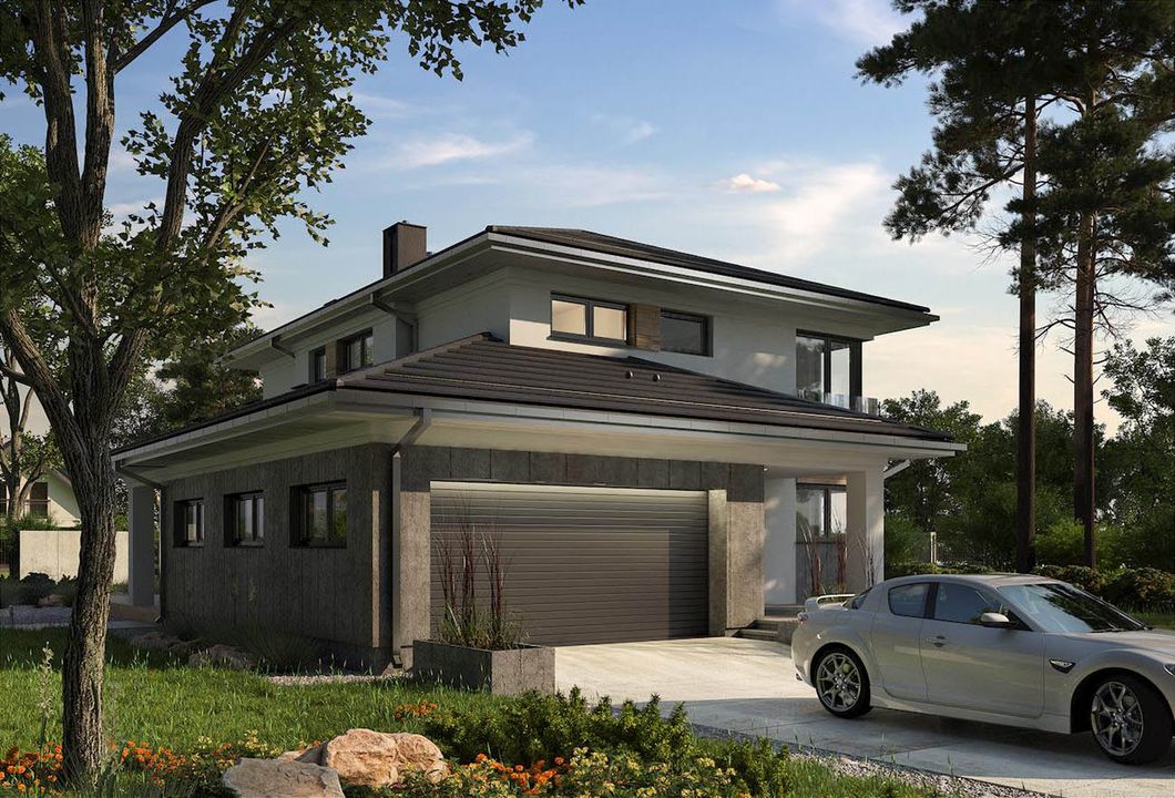Graficzne opracowanie rzutów poglądowych widocznych na karcie projektu zostało wykonane przez Extradom.pl. Prezentowane przez Extradom.pl wizualizacje wykonane zostały przez autora projektu i należy poczytywać je jedynie za przykład i propozycję wykończenia, wizję architektoniczną autora projektu. Ostateczne wykończenie budynku może nastąpić na wiele sposobów. Szczegółowe rozwiązania zastosowane w oferowanej dokumentacji - w tym również ilość, lokalizacje i wygląd okien, drzwi, kominów - mogą w niewielkim stopniu różnić się od prezentowanej wizualizacji budynku.