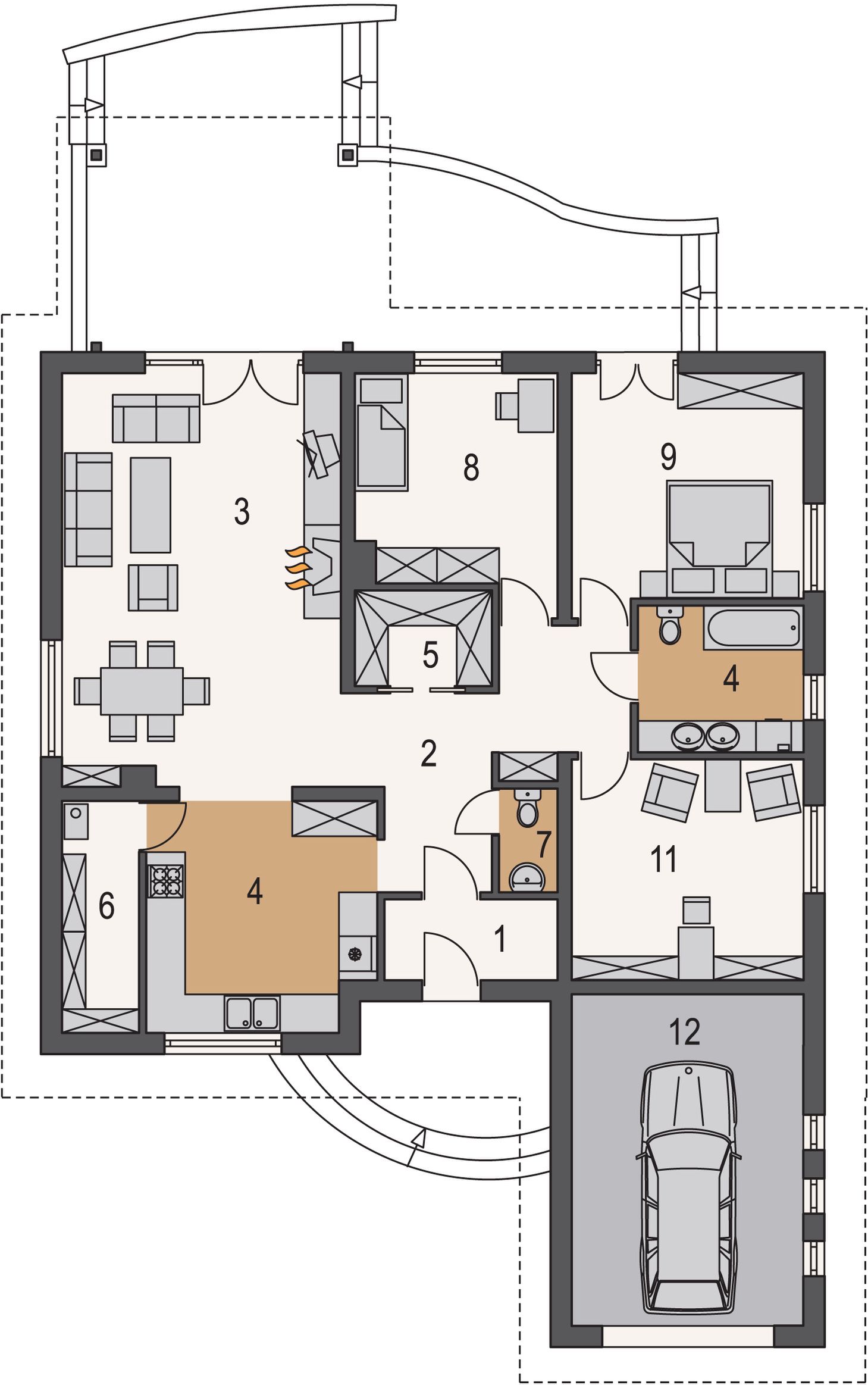 Graficzne opracowanie rzutów poglądowych widocznych na karcie projektu zostało wykonane przez Extradom.pl. Prezentowane przez Extradom.pl wizualizacje wykonane zostały przez autora projektu i należy poczytywać je jedynie za przykład i propozycję wykończenia, wizję architektoniczną autora projektu. Ostateczne wykończenie budynku może nastąpić na wiele sposobów. Szczegółowe rozwiązania zastosowane w oferowanej dokumentacji - w tym również ilość, lokalizacje i wygląd okien, drzwi, kominów - mogą w niewielkim stopniu różnić się od prezentowanej wizualizacji budynku.