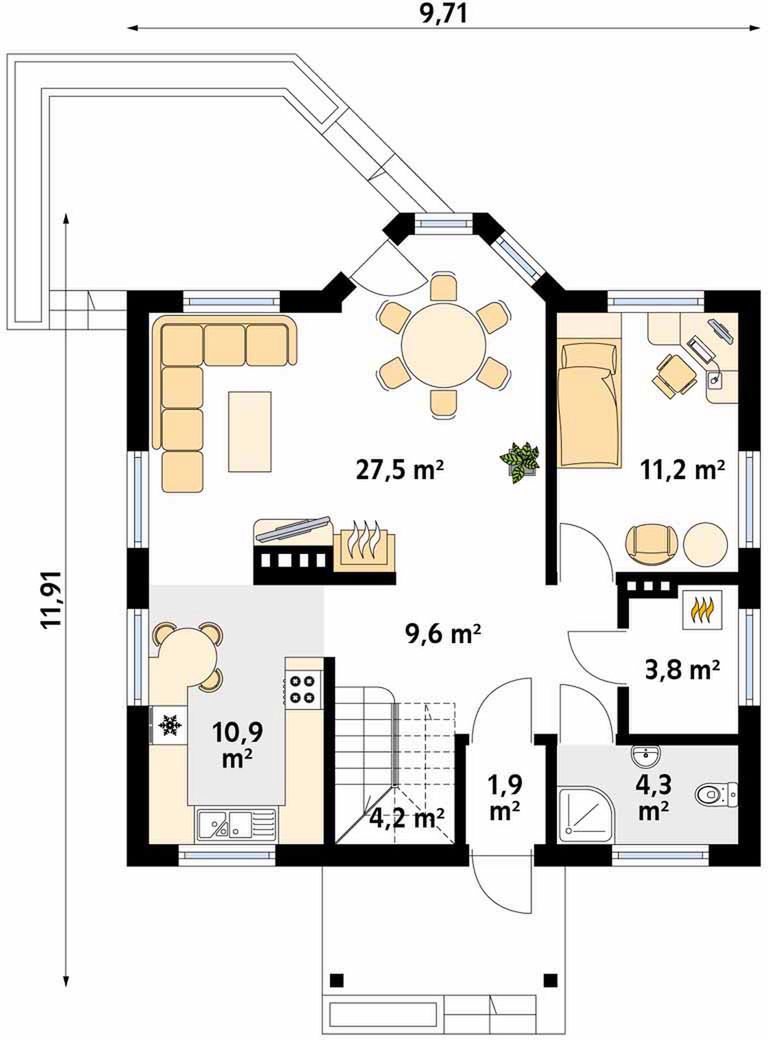Graficzne opracowanie rzutów poglądowych widocznych na karcie projektu zostało wykonane przez Extradom.pl. Prezentowane przez Extradom.pl wizualizacje wykonane zostały przez autora projektu i należy poczytywać je jedynie za przykład i propozycję wykończenia, wizję architektoniczną autora projektu. Ostateczne wykończenie budynku może nastąpić na wiele sposobów. Szczegółowe rozwiązania zastosowane w oferowanej dokumentacji - w tym również ilość, lokalizacje i wygląd okien, drzwi, kominów - mogą w niewielkim stopniu różnić się od prezentowanej wizualizacji budynku.