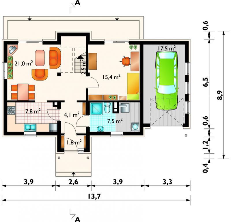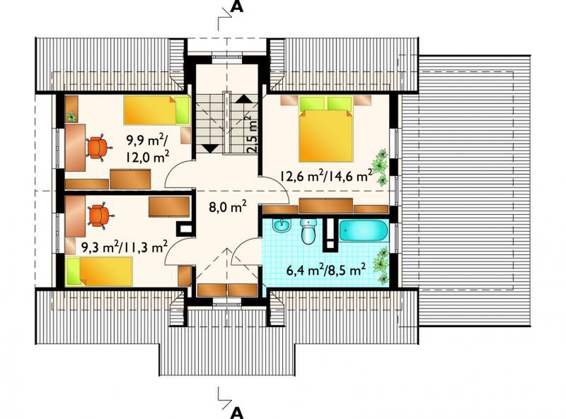 Graficzne opracowanie rzutów poglądowych widocznych na karcie projektu zostało wykonane przez Extradom.pl. Prezentowane przez Extradom.pl wizualizacje wykonane zostały przez autora projektu i należy poczytywać je jedynie za przykład i propozycję wykończenia, wizję architektoniczną autora projektu. Ostateczne wykończenie budynku może nastąpić na wiele sposobów. Szczegółowe rozwiązania zastosowane w oferowanej dokumentacji - w tym również ilość, lokalizacje i wygląd okien, drzwi, kominów - mogą w niewielkim stopniu różnić się od prezentowanej wizualizacji budynku.