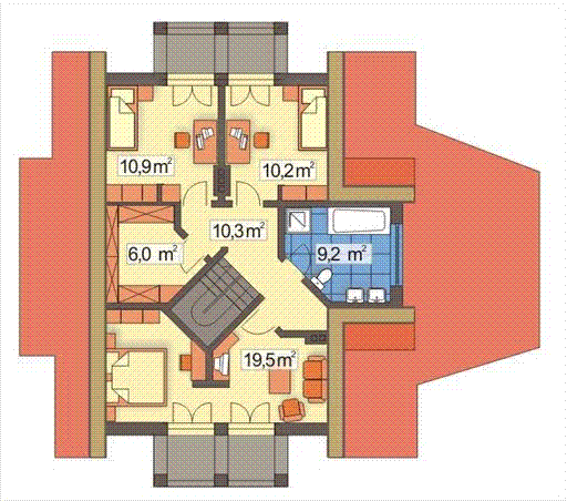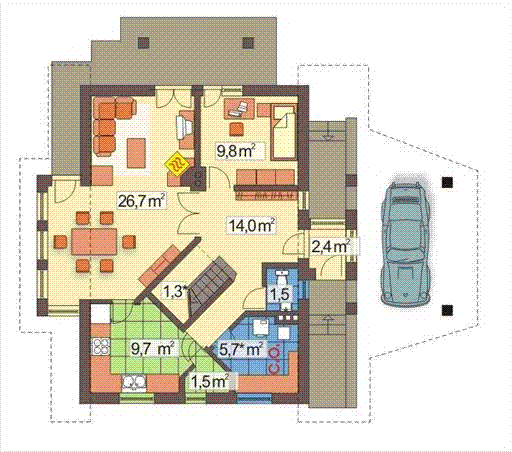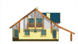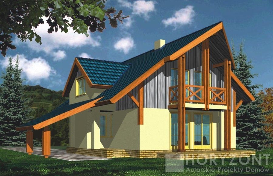 Graficzne opracowanie rzutów poglądowych widocznych na karcie projektu zostało wykonane przez Extradom.pl. Prezentowane przez Extradom.pl wizualizacje wykonane zostały przez autora projektu i należy poczytywać je jedynie za przykład i propozycję wykończenia, wizję architektoniczną autora projektu. Ostateczne wykończenie budynku może nastąpić na wiele sposobów. Szczegółowe rozwiązania zastosowane w oferowanej dokumentacji - w tym również ilość, lokalizacje i wygląd okien, drzwi, kominów - mogą w niewielkim stopniu różnić się od prezentowanej wizualizacji budynku.