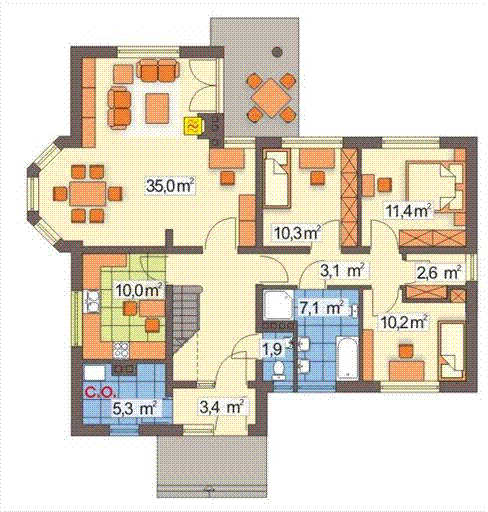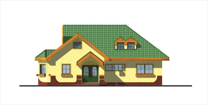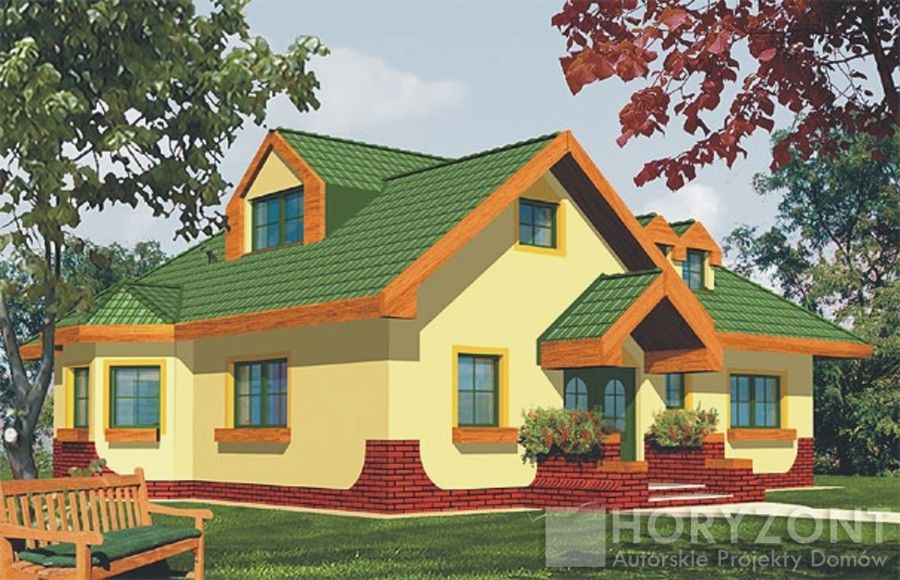 Graficzne opracowanie rzutów poglądowych widocznych na karcie projektu zostało wykonane przez Extradom.pl. Prezentowane przez Extradom.pl wizualizacje wykonane zostały przez autora projektu i należy poczytywać je jedynie za przykład i propozycję wykończenia, wizję architektoniczną autora projektu. Ostateczne wykończenie budynku może nastąpić na wiele sposobów. Szczegółowe rozwiązania zastosowane w oferowanej dokumentacji - w tym również ilość, lokalizacje i wygląd okien, drzwi, kominów - mogą w niewielkim stopniu różnić się od prezentowanej wizualizacji budynku.