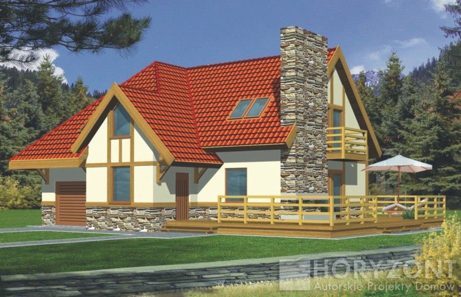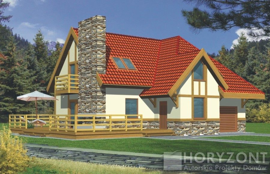 Graficzne opracowanie rzutów poglądowych widocznych na karcie projektu zostało wykonane przez Extradom.pl. Prezentowane przez Extradom.pl wizualizacje wykonane zostały przez autora projektu i należy poczytywać je jedynie za przykład i propozycję wykończenia, wizję architektoniczną autora projektu. Ostateczne wykończenie budynku może nastąpić na wiele sposobów. Szczegółowe rozwiązania zastosowane w oferowanej dokumentacji - w tym również ilość, lokalizacje i wygląd okien, drzwi, kominów - mogą w niewielkim stopniu różnić się od prezentowanej wizualizacji budynku.