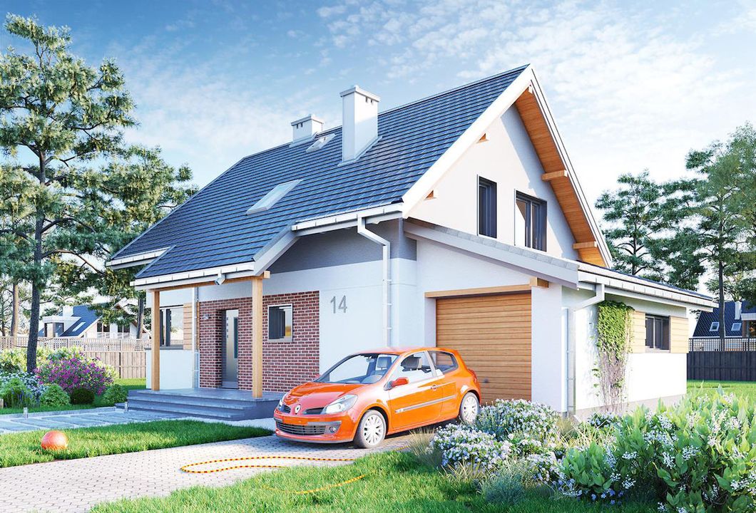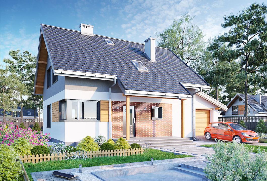Graficzne opracowanie rzutów poglądowych widocznych na karcie projektu zostało wykonane przez Extradom.pl. Prezentowane przez Extradom.pl wizualizacje wykonane zostały przez autora projektu i należy poczytywać je jedynie za przykład i propozycję wykończenia, wizję architektoniczną autora projektu. Ostateczne wykończenie budynku może nastąpić na wiele sposobów. Szczegółowe rozwiązania zastosowane w oferowanej dokumentacji - w tym również ilość, lokalizacje i wygląd okien, drzwi, kominów - mogą w niewielkim stopniu różnić się od prezentowanej wizualizacji budynku.