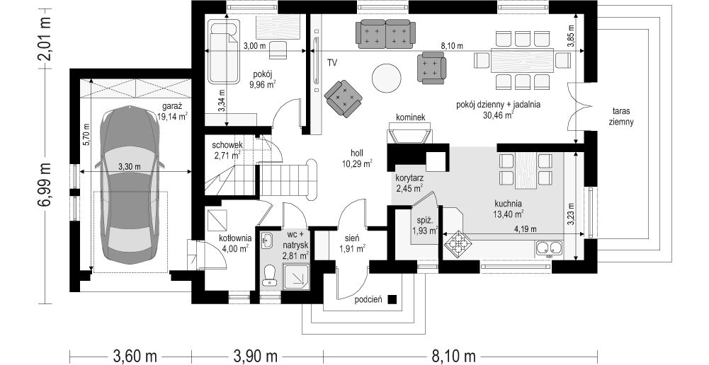 Fundamenty: betonowe wylewane. Ściany zewnętrzne: bloczki z betonu komórkowego + styropian. Strop: Teriva. Elewacje: tynk cienkopowłokowy. Pokrycie dachu: dachówka ceramiczna lub blachodachówka. Nachylenie dachu: 42 stopnie.