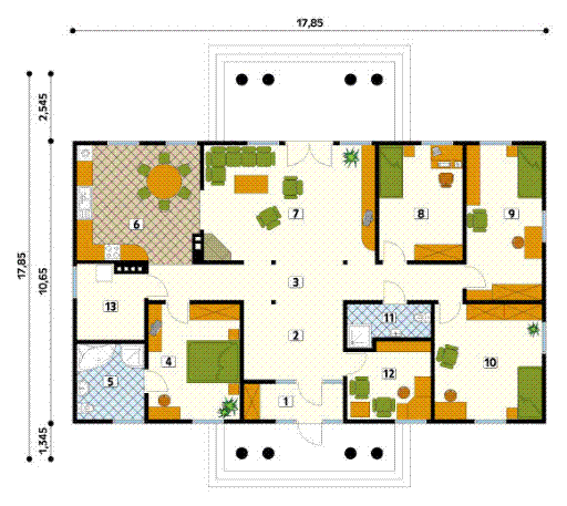 Graficzne opracowanie rzutów poglądowych widocznych na karcie projektu zostało wykonane przez Extradom.pl. Prezentowane przez Extradom.pl wizualizacje wykonane zostały przez autora projektu i należy poczytywać je jedynie za przykład i propozycję wykończenia, wizję architektoniczną autora projektu. Ostateczne wykończenie budynku może nastąpić na wiele sposobów. Szczegółowe rozwiązania zastosowane w oferowanej dokumentacji - w tym również ilość, lokalizacje i wygląd okien, drzwi, kominów - mogą w niewielkim stopniu różnić się od prezentowanej wizualizacji budynku.
