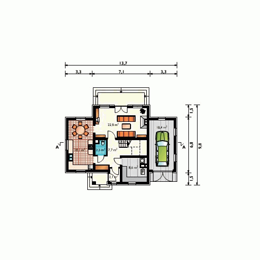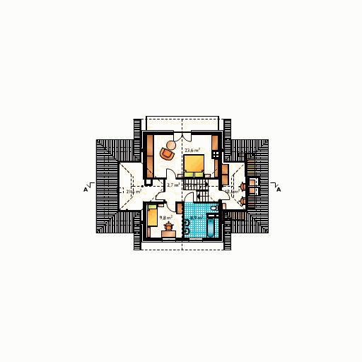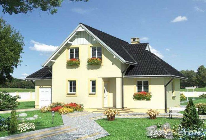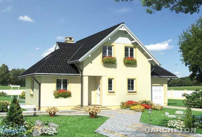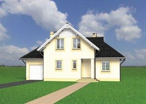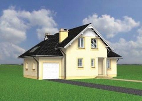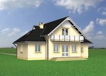 Graficzne opracowanie rzutów poglądowych widocznych na karcie projektu zostało wykonane przez Extradom.pl. Prezentowane przez Extradom.pl wizualizacje wykonane zostały przez autora projektu i należy poczytywać je jedynie za przykład i propozycję wykończenia, wizję architektoniczną autora projektu. Ostateczne wykończenie budynku może nastąpić na wiele sposobów. Szczegółowe rozwiązania zastosowane w oferowanej dokumentacji - w tym również ilość, lokalizacje i wygląd okien, drzwi, kominów - mogą w niewielkim stopniu różnić się od prezentowanej wizualizacji budynku.