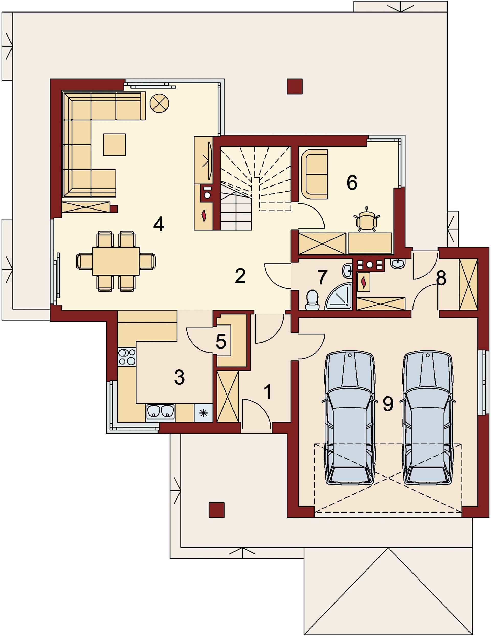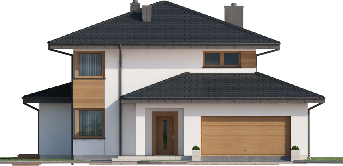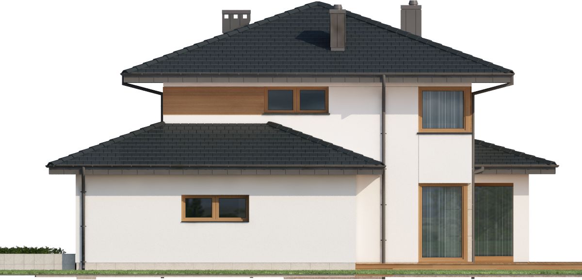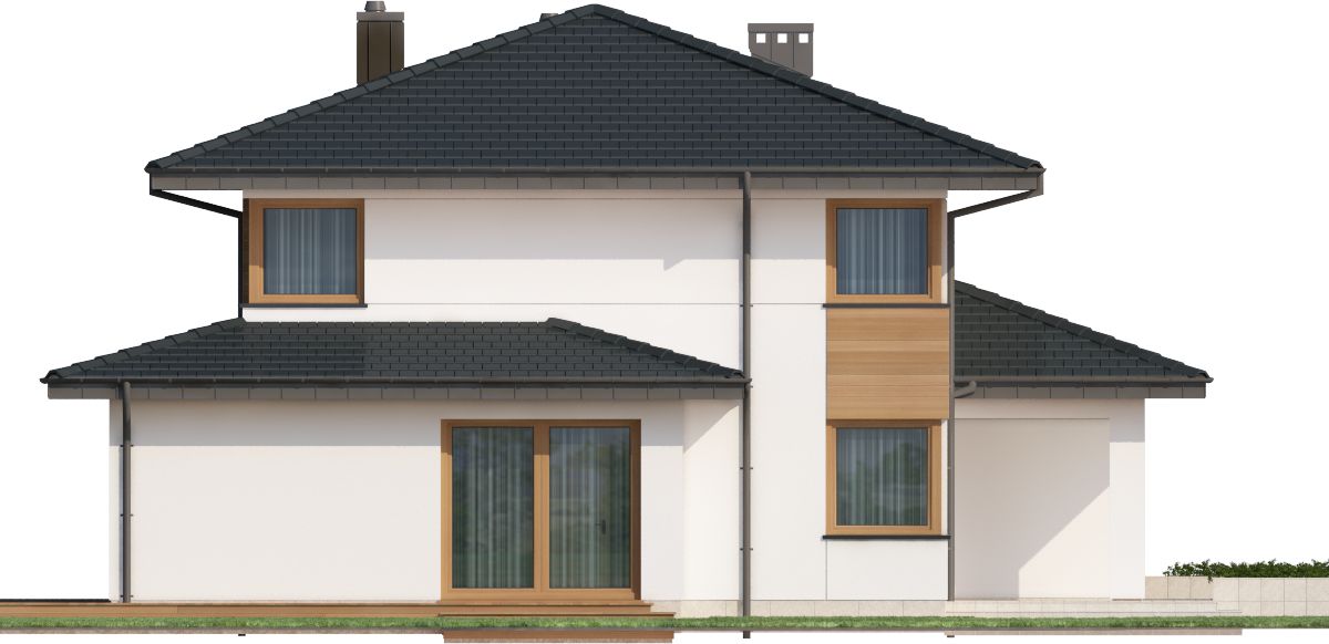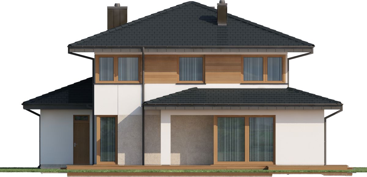 Graficzne opracowanie rzutów poglądowych widocznych na karcie projektu zostało wykonane przez Extradom.pl. Prezentowane przez Extradom.pl wizualizacje wykonane zostały przez autora projektu i należy poczytywać je jedynie za przykład i propozycję wykończenia, wizję architektoniczną autora projektu. Ostateczne wykończenie budynku może nastąpić na wiele sposobów. Szczegółowe rozwiązania zastosowane w oferowanej dokumentacji - w tym również ilość, lokalizacje i wygląd okien, drzwi, kominów - mogą w niewielkim stopniu różnić się od prezentowanej wizualizacji budynku.