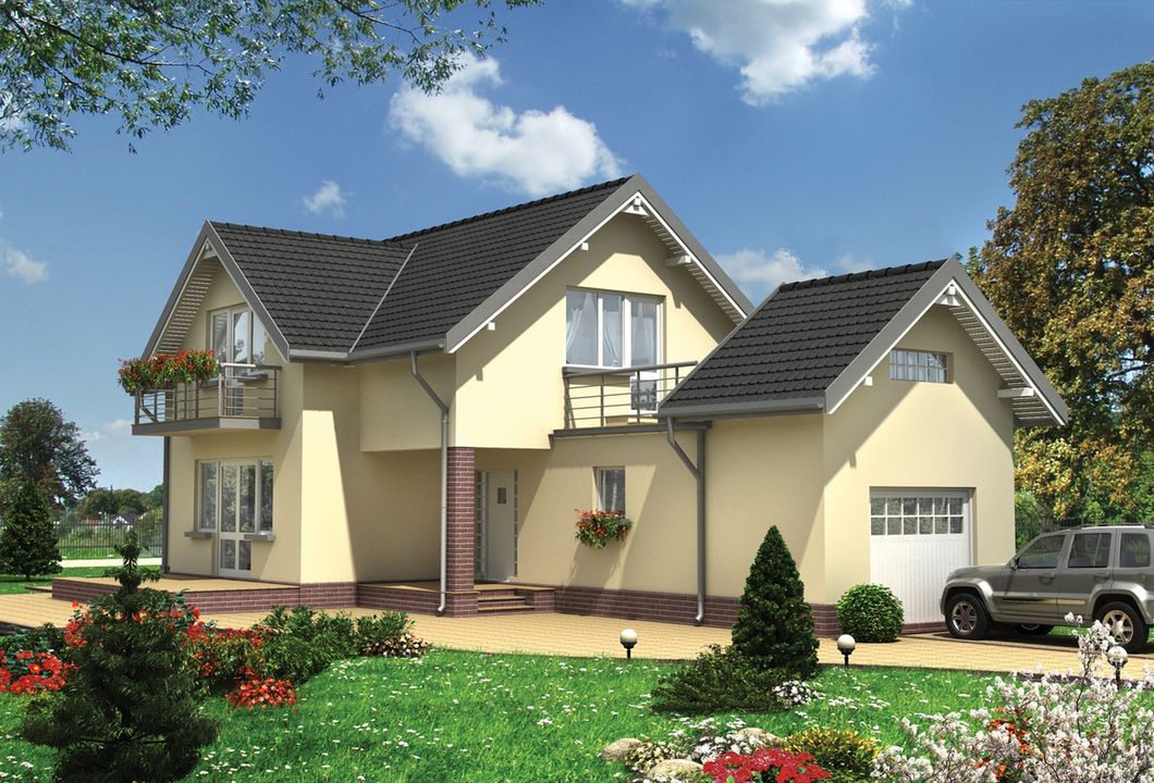 Graficzne opracowanie rzutów poglądowych widocznych na karcie projektu zostało wykonane przez Extradom.pl. Prezentowane przez Extradom.pl wizualizacje wykonane zostały przez autora projektu i należy poczytywać je jedynie za przykład i propozycję wykończenia, wizję architektoniczną autora projektu. Ostateczne wykończenie budynku może nastąpić na wiele sposobów. Szczegółowe rozwiązania zastosowane w oferowanej dokumentacji - w tym również ilość, lokalizacje i wygląd okien, drzwi, kominów - mogą w niewielkim stopniu różnić się od prezentowanej wizualizacji budynku.
