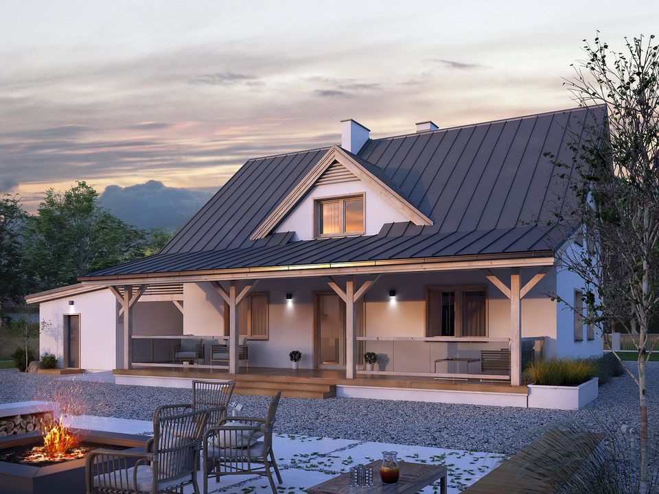 Graficzne opracowanie rzutów poglądowych widocznych na karcie projektu zostało wykonane przez Extradom.pl. Prezentowane przez Extradom.pl wizualizacje wykonane zostały przez autora projektu i należy poczytywać je jedynie za przykład i propozycję wykończenia, wizję architektoniczną autora projektu. Ostateczne wykończenie budynku może nastąpić na wiele sposobów. Szczegółowe rozwiązania zastosowane w oferowanej dokumentacji - w tym również ilość, lokalizacje i wygląd okien, drzwi, kominów - mogą w niewielkim stopniu różnić się od prezentowanej wizualizacji budynku.