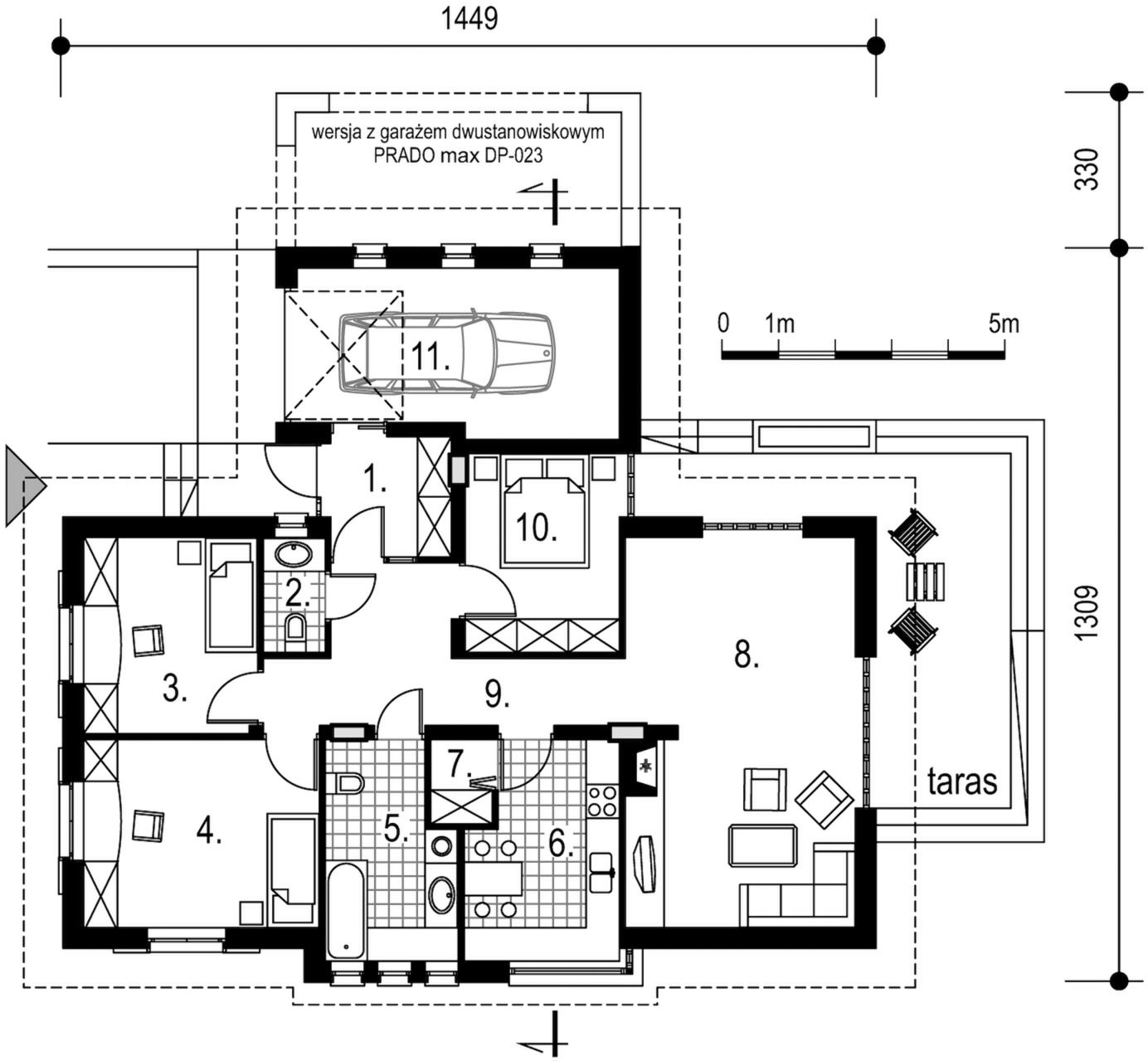 Ściany zewnętrzne dwuwarstwowe: cegła SILKA + wełna mineralna + tynk. Ściany wewnętrzne: cegła SILKA i/lub płyty na ruszcie stalowym, wygłuszone wełną mineralną. Strop: drewniany. Więźba dachowa: tradycyjna drewniana. Poszycie dachu: dachówka cementowa. Stolarka: drewniana lub PCV. Instalacja centralnego ogrzewania: kocioł dwufunkcyjny + grzejniki.