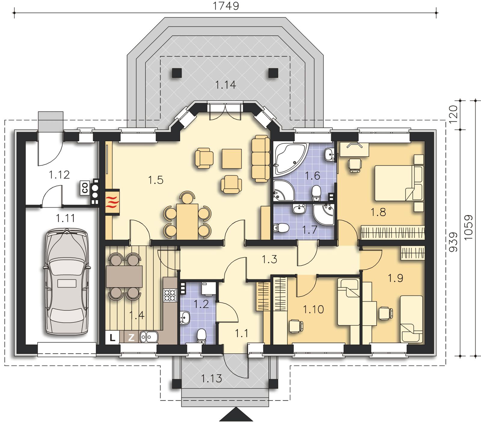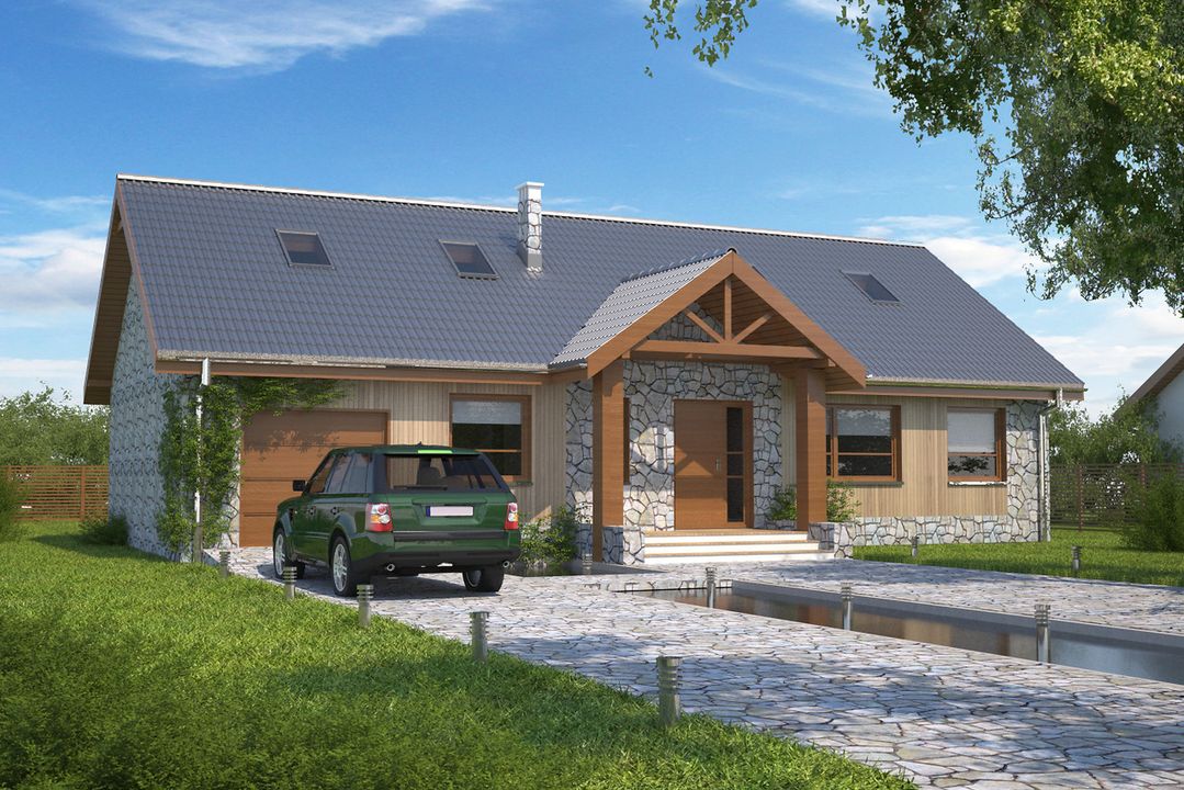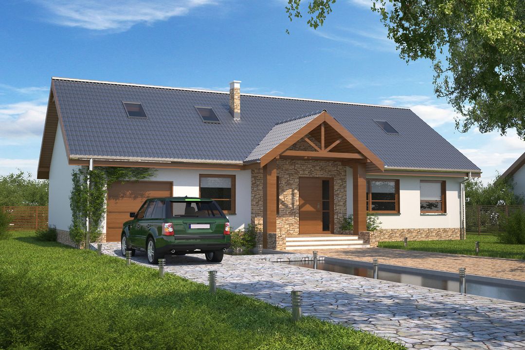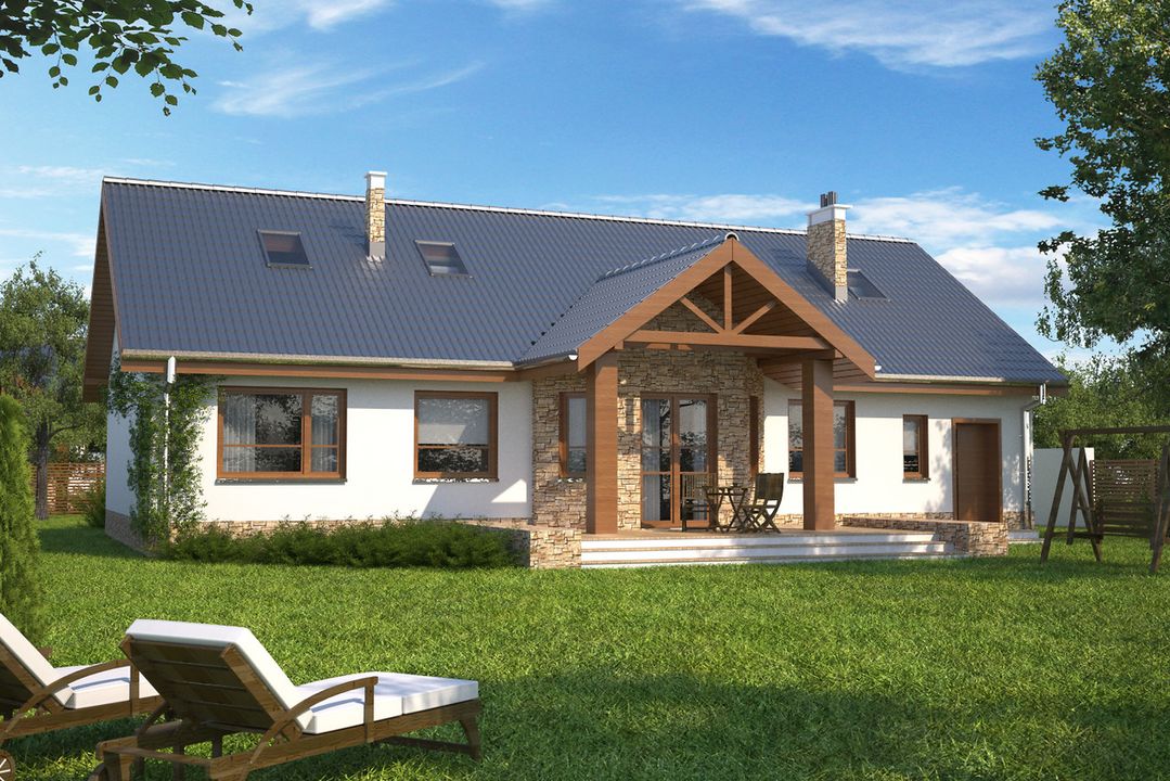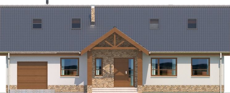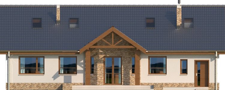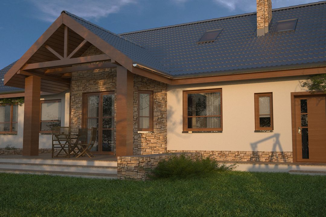 Graficzne opracowanie rzutów poglądowych widocznych na karcie projektu zostało wykonane przez Extradom.pl. Prezentowane przez Extradom.pl wizualizacje wykonane zostały przez autora projektu i należy poczytywać je jedynie za przykład i propozycję wykończenia, wizję architektoniczną autora projektu. Ostateczne wykończenie budynku może nastąpić na wiele sposobów. Szczegółowe rozwiązania zastosowane w oferowanej dokumentacji - w tym również ilość, lokalizacje i wygląd okien, drzwi, kominów - mogą w niewielkim stopniu różnić się od prezentowanej wizualizacji budynku.