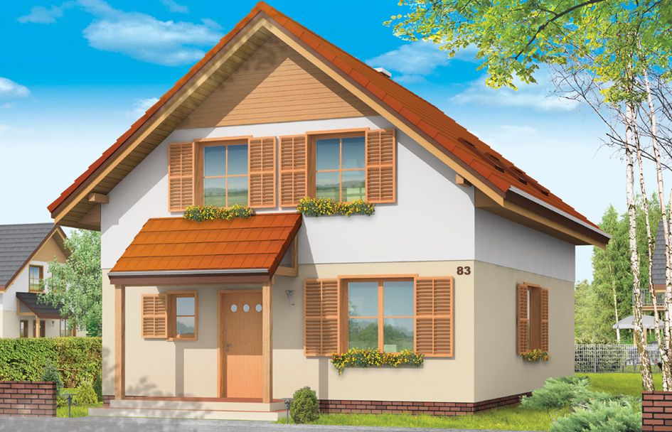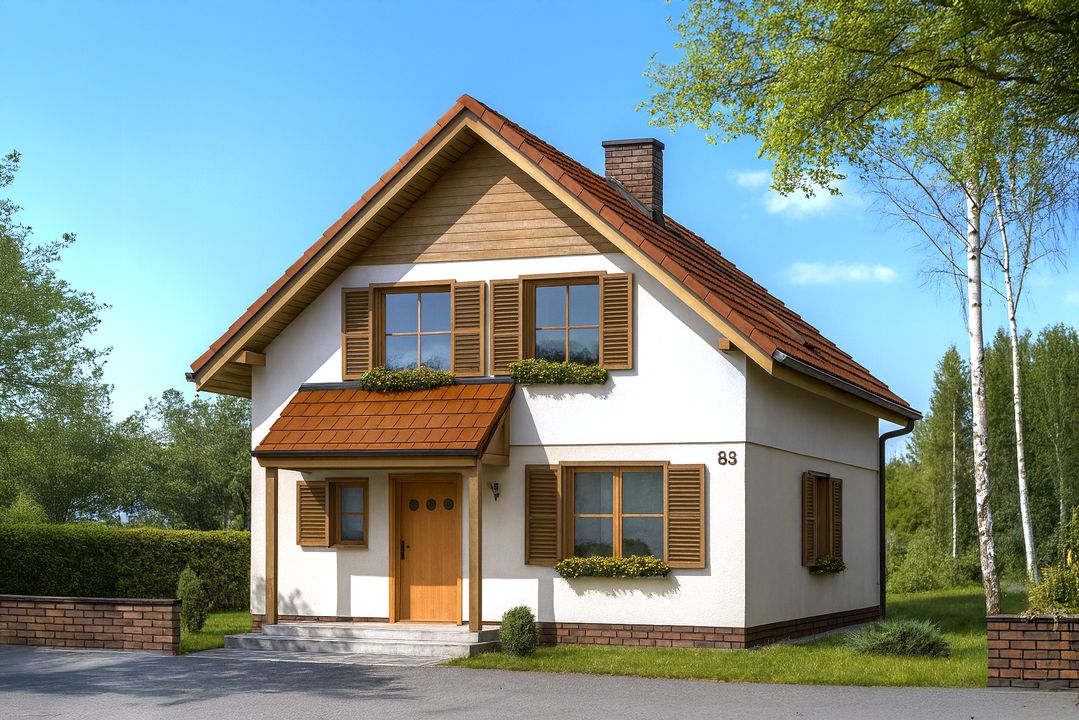 Fundamenty: betonowe wylewane. Ściany zewnętrzne: konstrukcja drewniana szkieletowa z kantówki 14x4 + OSB + docieplenie wełną mineralną 10 cm + tynk cienkowarstwowy. Strop: belkowy drewniany. Elewacje: tynk cienkowarstwowy. Pokrycie dachu: blachodachówka lub dachówka. Nachylenie dachu: 38 stopnie.