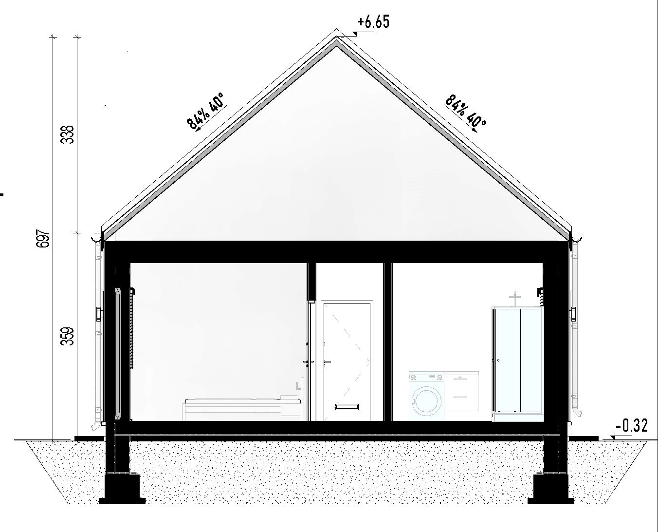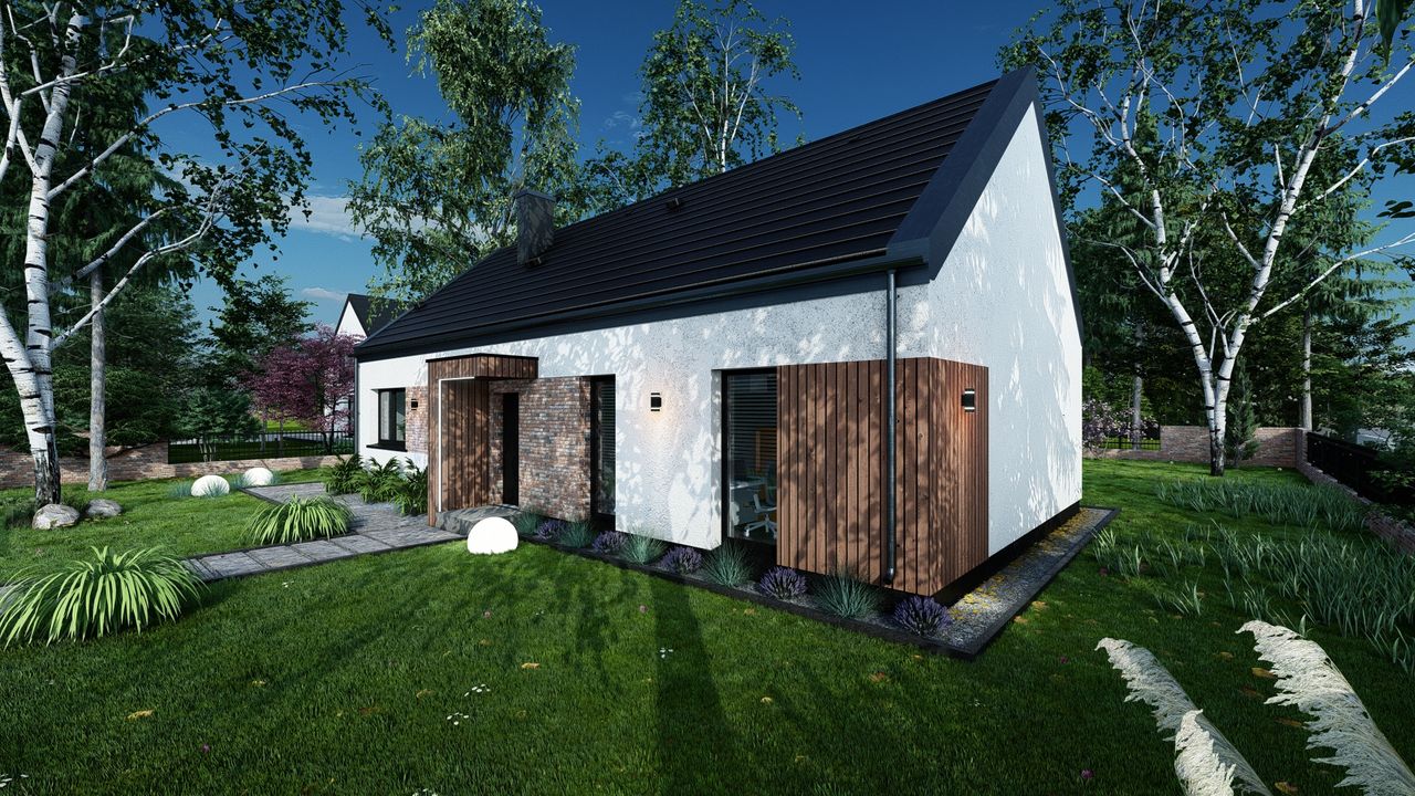 Fundamenty: tradycyjne – ławy i stopy fundamentowe, ściany zewnętrzne: gazobeton + styropian 20 cm, elewacja: tynk, deska elewacyjna, cegła, strop: drewniany, konstrukcja dachu: prefabrykowana kratownica drewniana, pokrycie dachówką ceramiczną lub cementową, ogrzewanie: powietrzna pompa ciepła o mocy 6–7 kW typu powietrze–woda z ogrzewaniem podłogowym, wentylacja: grawitacyjna.