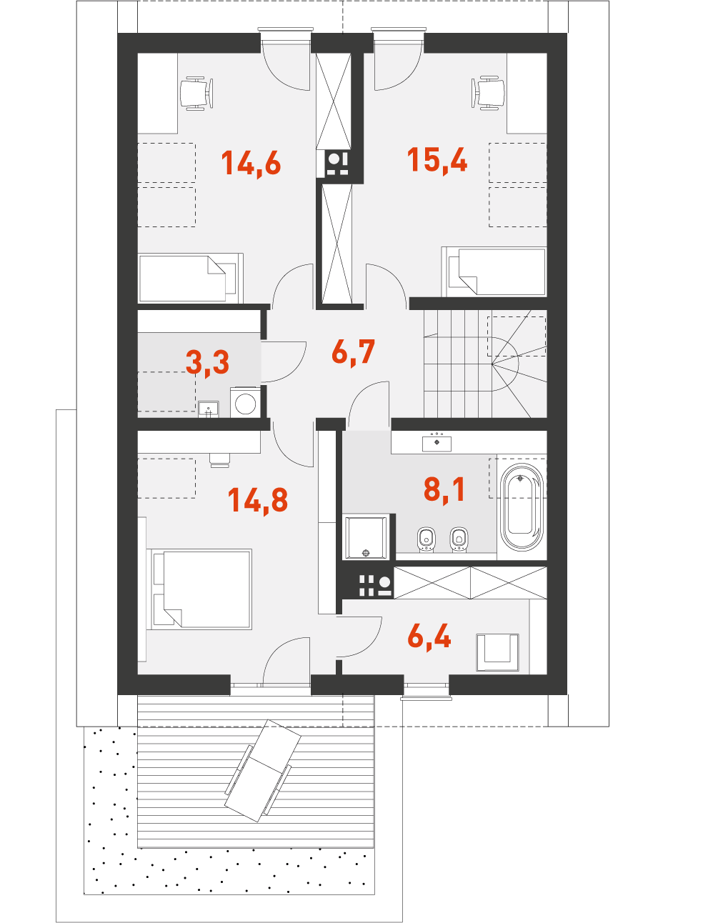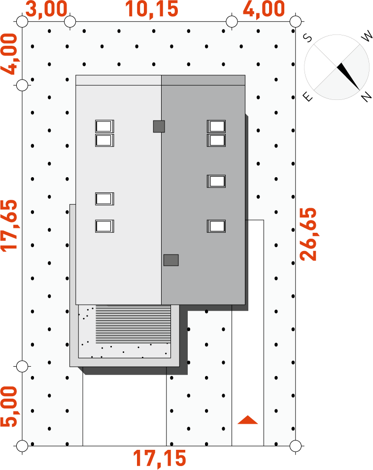 Konstrukcja: zgodna z normami EUROKOD. Fundamenty: tradycyjne ławy i stopy żelbetowe. Ściany: bloczek silikatowy + styropian na etapie adaptacji projektu istnieje możliwość zamiany bloczka silikatowego na inny materiał o podobnych parametrach wytrzymałosciowych, np. na pustak ceramiczny. Elewacja: tynk, płyta elewacyjna z włóknocementu płytę elewacyjną z włóknocementu wykorzystaną jako materiał dekoracyjny można zamienić na etapie adaptacji projektu na inny, np. na deskę elewacyjną. Stropy: żelbetowe wylewane na etapie adaptacji projektu istnieje możliwość zmiany technologii stropu na gęstożebrowy lub prefabrykowany. Schody: konstrukcji lekkiej konstrukcja oraz materiały wykończeniowe schodów przewidziane do indywidualnej aranżacji. Możesz skorzystać z usług naszego Partnera. Formularz ofertowy dostępny w zakładce „kosztorys”. Dach: dachówka ceramiczna lub cementowa konstrukcja więźby przewidziana pod pokrycie ciężkie dla I strefy wiatrowej i II strefy śniegowej.