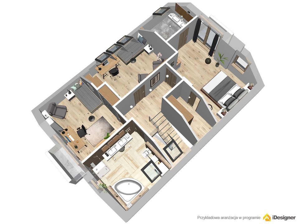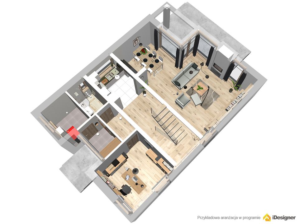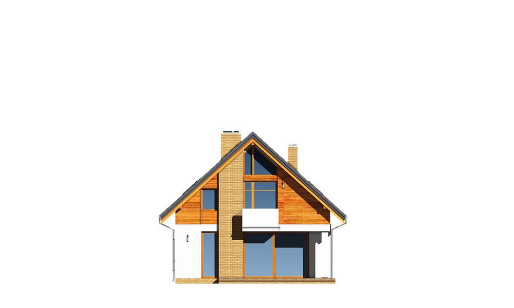 Graficzne opracowanie rzutów poglądowych widocznych na karcie projektu zostało wykonane przez Extradom.pl. Prezentowane przez Extradom.pl wizualizacje wykonane zostały przez autora projektu i należy poczytywać je jedynie za przykład i propozycję wykończenia, wizję architektoniczną autora projektu. Ostateczne wykończenie budynku może nastąpić na wiele sposobów. Szczegółowe rozwiązania zastosowane w oferowanej dokumentacji - w tym również ilość, lokalizacje i wygląd okien, drzwi, kominów - mogą w niewielkim stopniu różnić się od prezentowanej wizualizacji budynku.