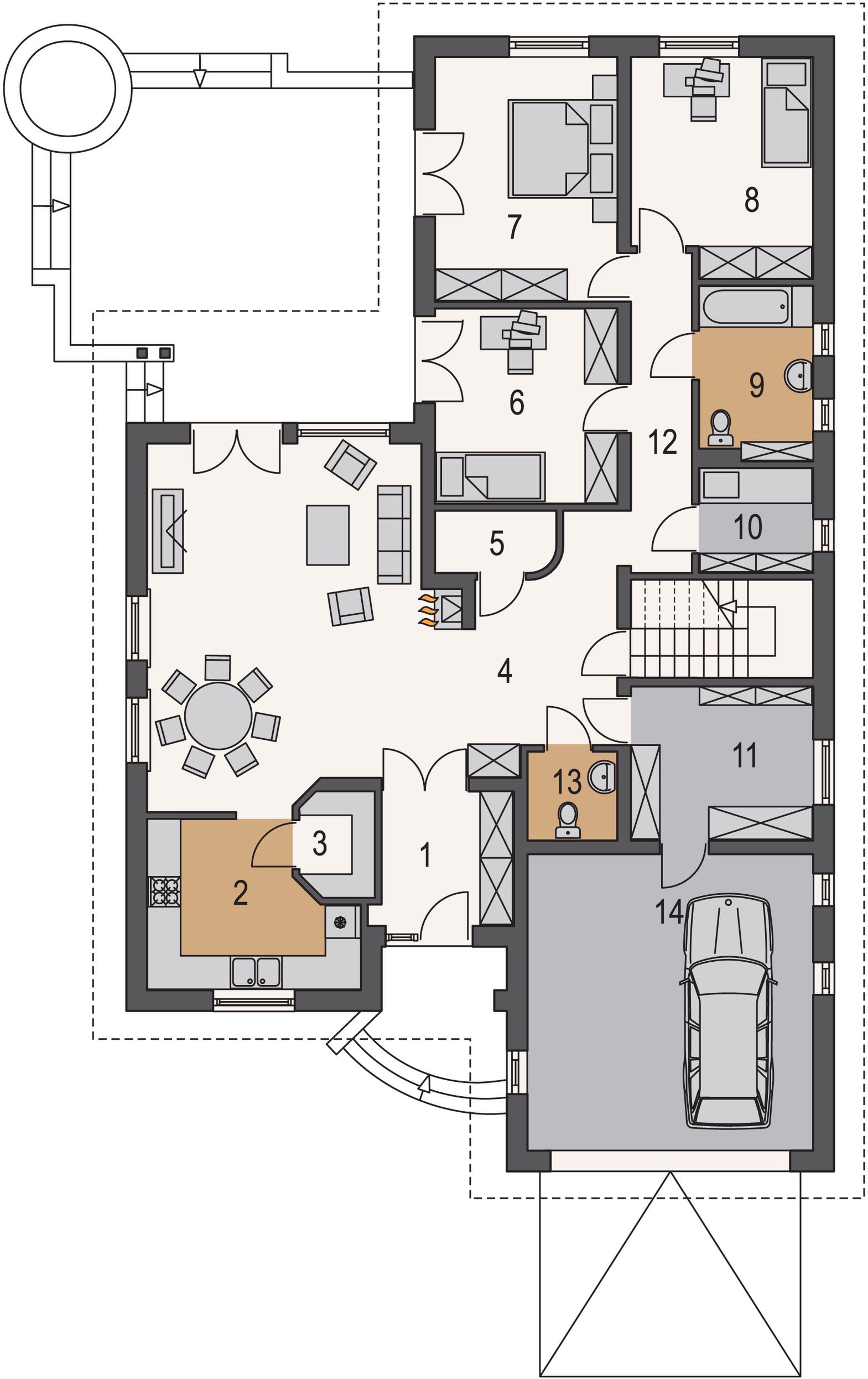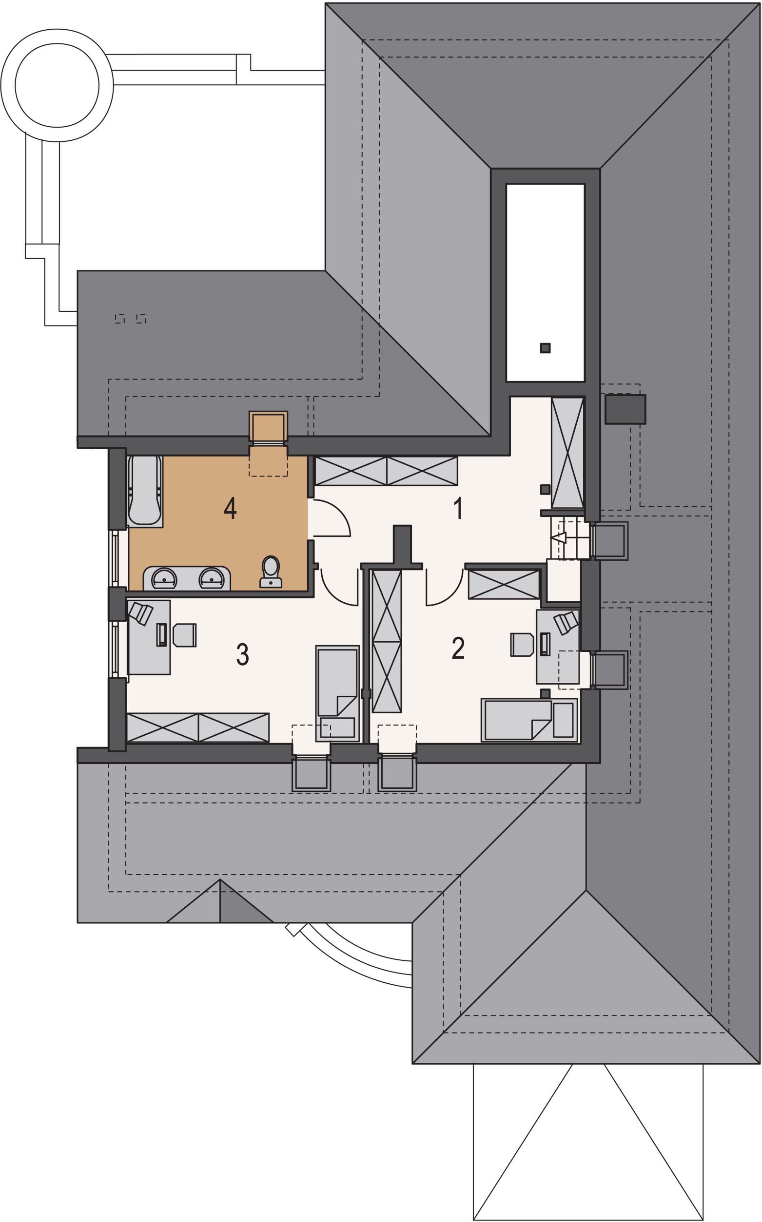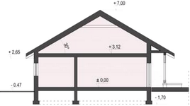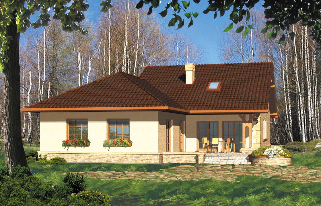 Graficzne opracowanie rzutów poglądowych widocznych na karcie projektu zostało wykonane przez Extradom.pl. Prezentowane przez Extradom.pl wizualizacje wykonane zostały przez autora projektu i należy poczytywać je jedynie za przykład i propozycję wykończenia, wizję architektoniczną autora projektu. Ostateczne wykończenie budynku może nastąpić na wiele sposobów. Szczegółowe rozwiązania zastosowane w oferowanej dokumentacji - w tym również ilość, lokalizacje i wygląd okien, drzwi, kominów - mogą w niewielkim stopniu różnić się od prezentowanej wizualizacji budynku.