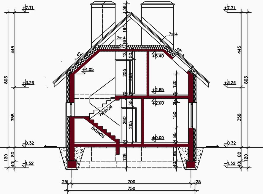 Ściany zewnętrzne: pustak ceramiczny 30 cm + 15 cm ocieplenie. Ściany wewnętrzne nośne: pustak ceramiczny 25 cm. Ściany wewnętrzne działowe: pustak ceramiczny 12 cm. Strop nad parterem: żelbetowy. Pokrycie dachu: dachówka ceramiczna. Strop nad poddaszem: żelbetowy.