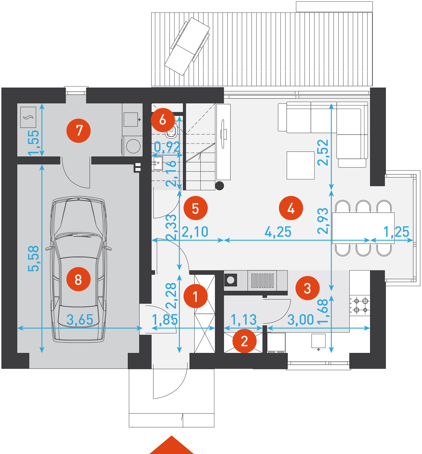 Konstrukcja: zgodna z normami EUROKOD. Fundamenty: tradycyjne ławy i stopy żelbetowe. Ściany: bloczek silikatowy + styropian na etapie adaptacji projektu istnieje możliwość zamiany bloczka silikatowego na inny materiał o podobnych parametrach wytrzymałosciowych, np. na pustak ceramiczny. Elewacja: tynk, deska elewacyjna deskę elewacyjną wykorzystaną jako materiał dekoracyjny można zamienić na etapie adaptacji projektu na inny, np. na płytkę klinkierową. Stropy: żelbetowe wylewane na etapie adaptacji projektu istnieje możliwość zmiany technologii stropu na gęstożebrowy lub prefabrykowany. Schody: żelbetowe Dach: dachówka ceramiczna lub cementowa konstrukcja więźby przewidziana pod pokrycie ciężkie dla I strefy wiatrowej i II strefy śniegowej.