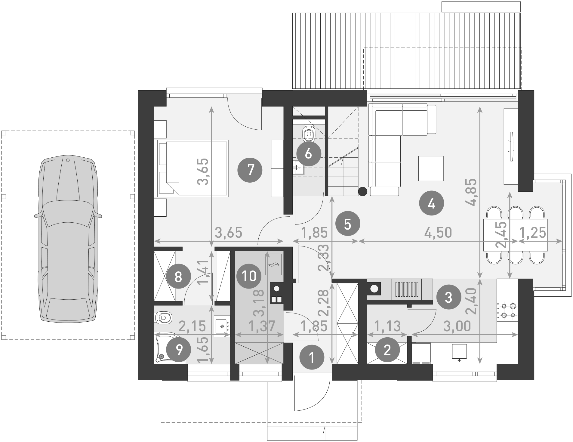 Konstrukcja: zgodna z normami EUROKOD. Fundamenty: tradycyjne ławy i stopy żelbetowe. Ściany: bloczek silikatowy + styropian na etapie adaptacji projektu istnieje możliwość zamiany bloczka silikatowego na inny materiał o podobnych parametrach wytrzymałosciowych, np. na pustak ceramiczny. Elewacja: tynk, deska elewacyjna deskę elewacyjną wykorzystaną jako materiał dekoracyjny można zamienić na etapie adaptacji projektu na inny, np. na płytkę klinkierową. Stropy: żelbetowe wylewane na etapie adaptacji projektu istnieje możliwość zmiany technologii stropu na gęstożebrowy lub prefabrykowany. Schody: żelbetowe Dach: blacha – panel na rąbek konstrukcja więźby przewidziana pod pokrycie ciężkie dla I strefy wiatrowej i II strefy śniegowej.