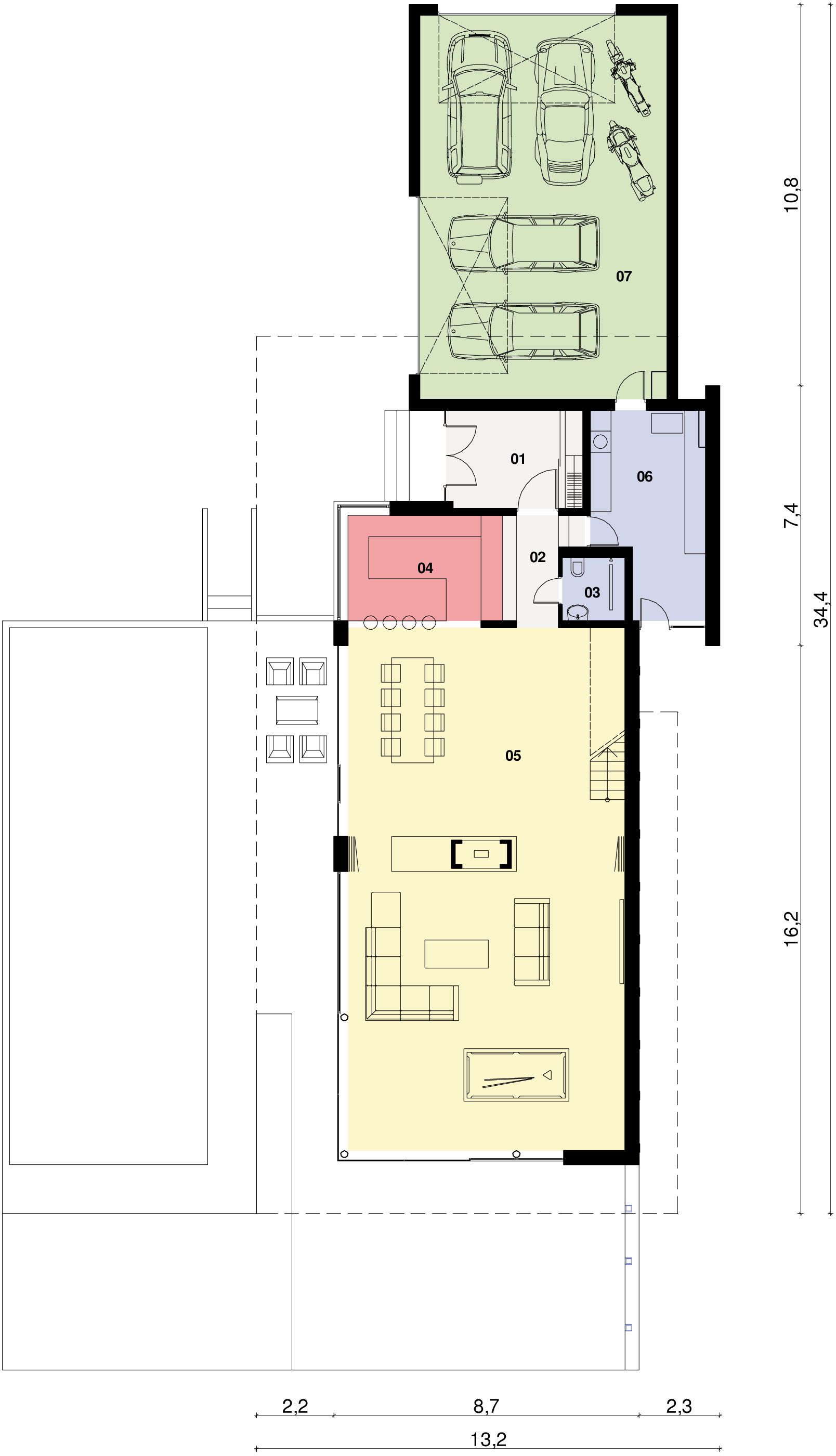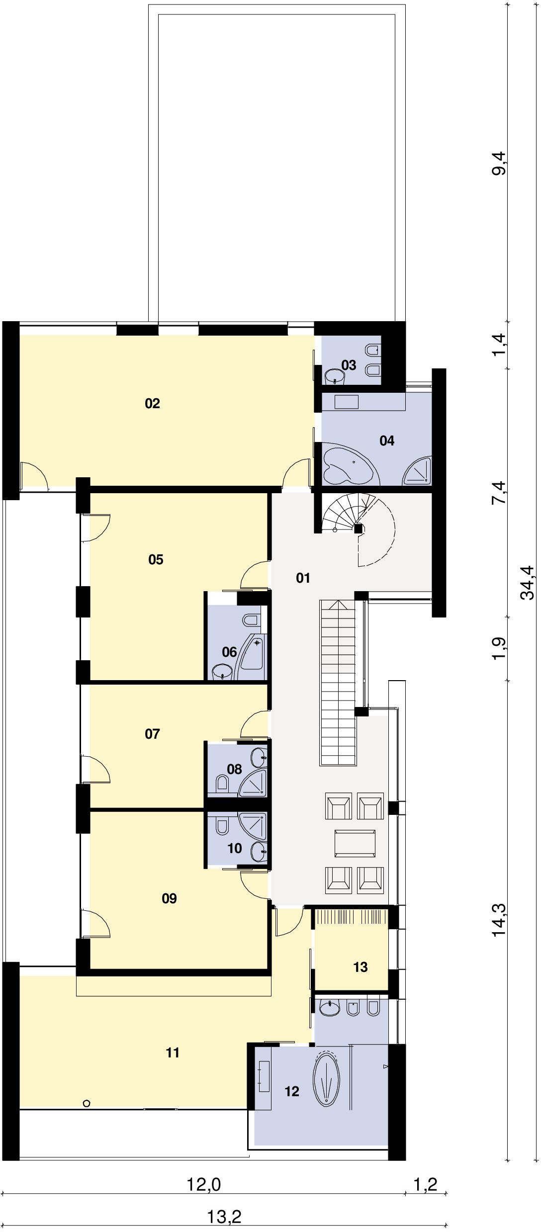 Graficzne opracowanie rzutów poglądowych widocznych na karcie projektu zostało wykonane przez Extradom.pl. Prezentowane przez Extradom.pl wizualizacje wykonane zostały przez autora projektu i należy poczytywać je jedynie za przykład i propozycję wykończenia, wizję architektoniczną autora projektu. Ostateczne wykończenie budynku może nastąpić na wiele sposobów. Szczegółowe rozwiązania zastosowane w oferowanej dokumentacji - w tym również ilość, lokalizacje i wygląd okien, drzwi, kominów - mogą w niewielkim stopniu różnić się od prezentowanej wizualizacji budynku.